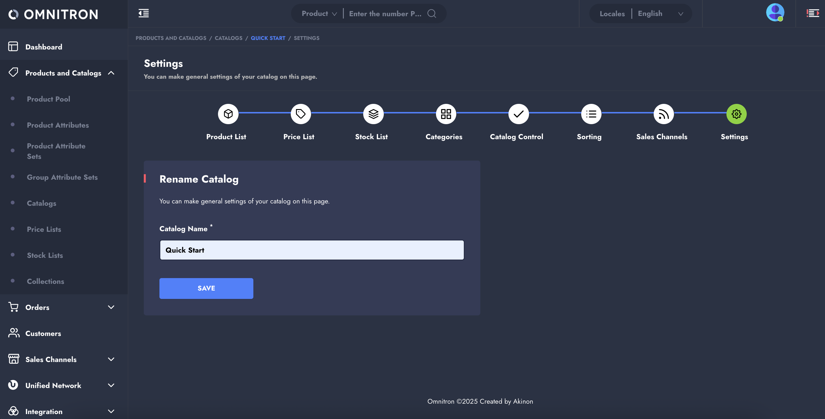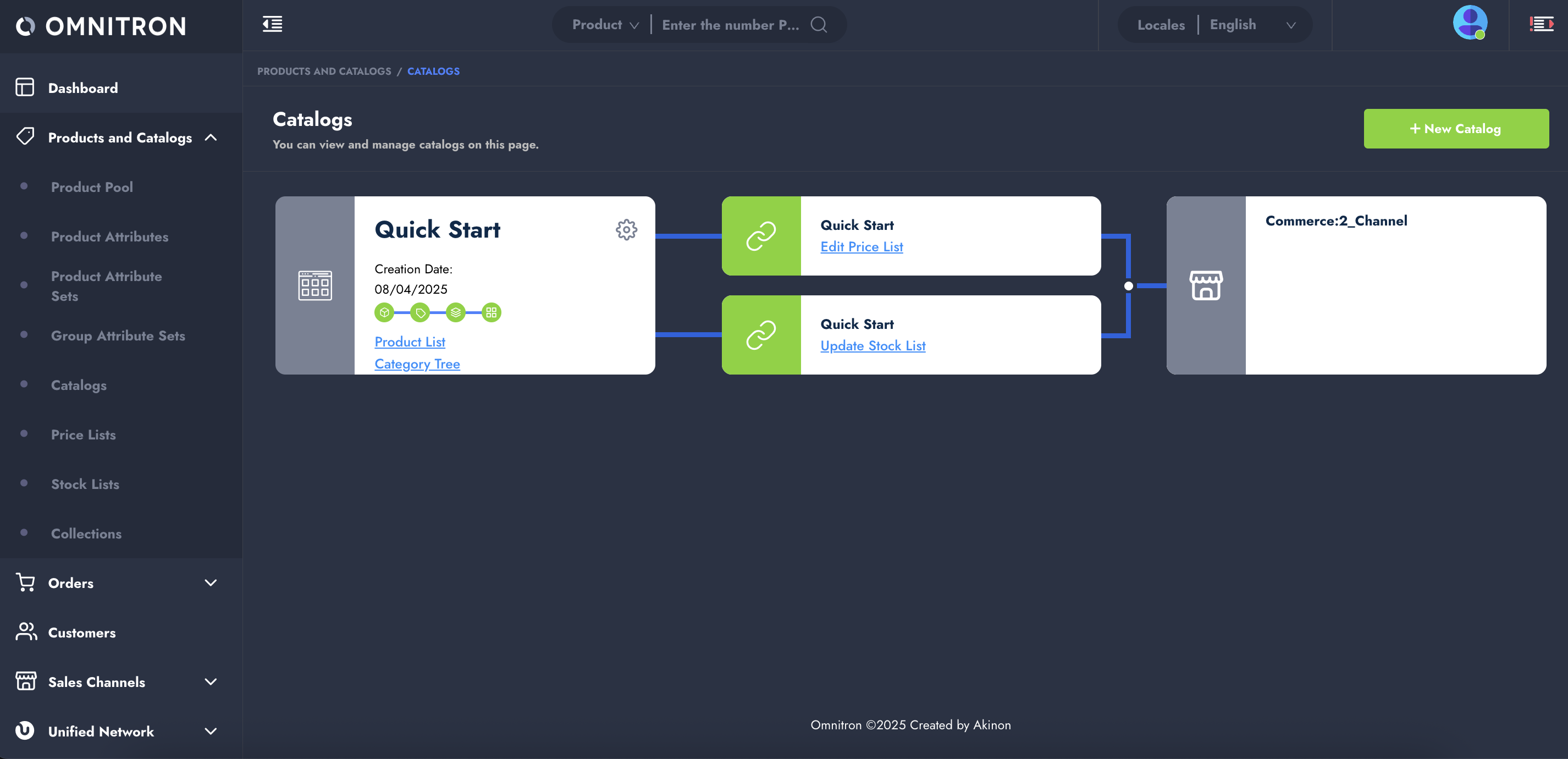 A **Catalog** is the foundational structure for managing products in Omnitron. It acts as a container that groups together product data, stock and price lists, and channel assignments. Every product you create, as well as its related configurations, must be assigned to a catalog to be published to the storefront.