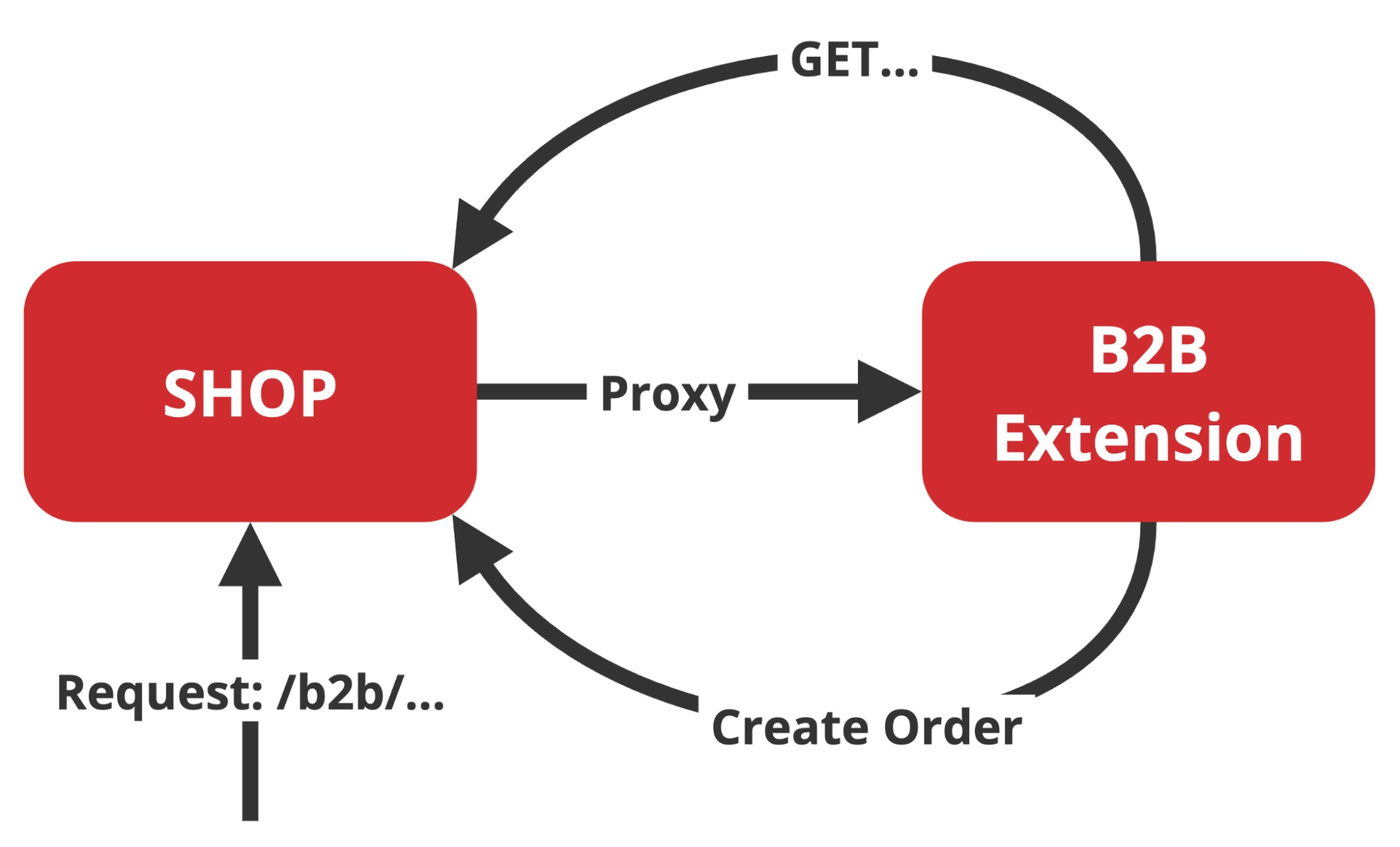 * B2B users access endpoints of B2B application via a proxy on Commerce like <https://shop.com/b2b/basket/>