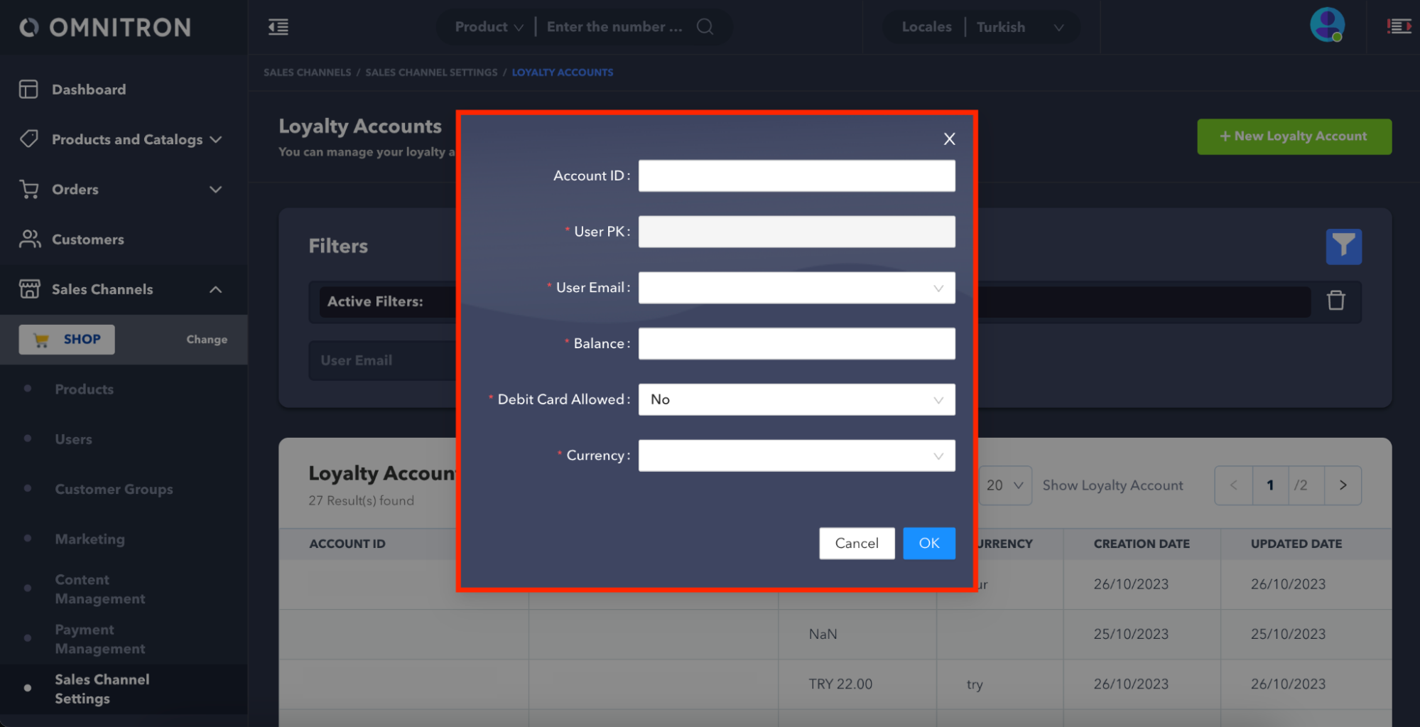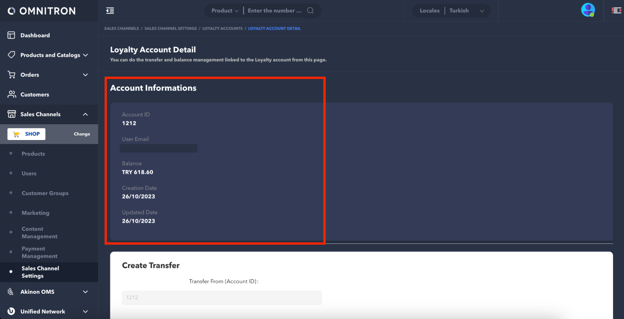 Before creating a loyalty account, make sure the user for whom you intend to create a loyalty account already has a registered account in the sales channel.