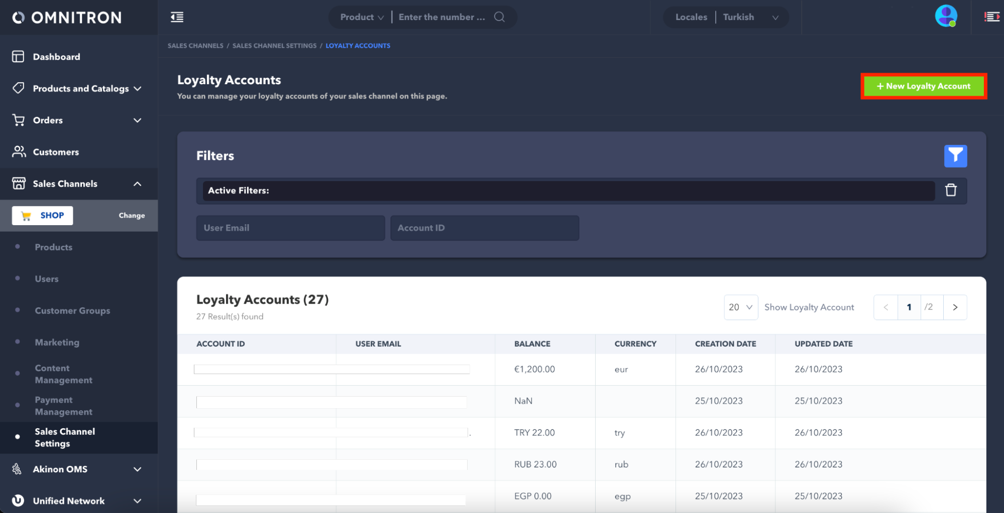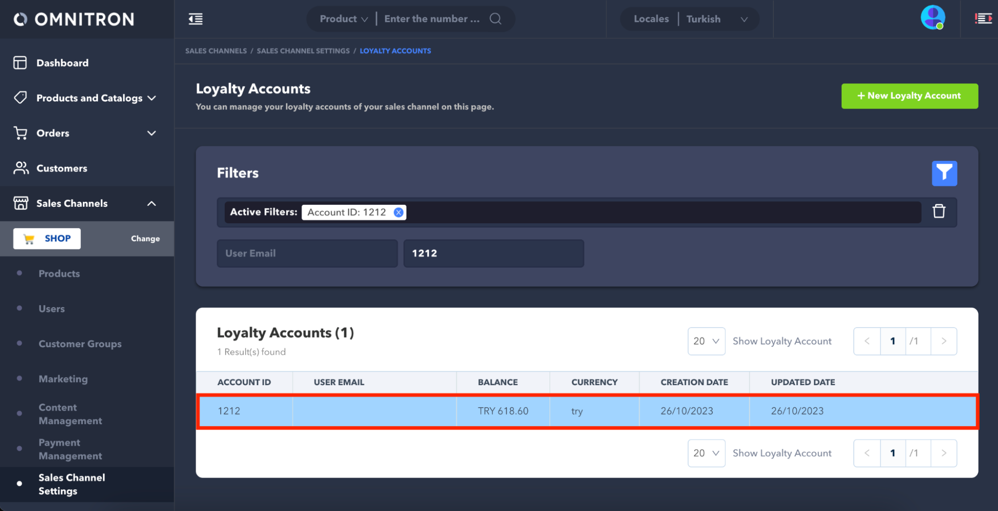 Follow the Sales Channels > Sales Channel Settings sidebar and click the Loyalty Accounts page.