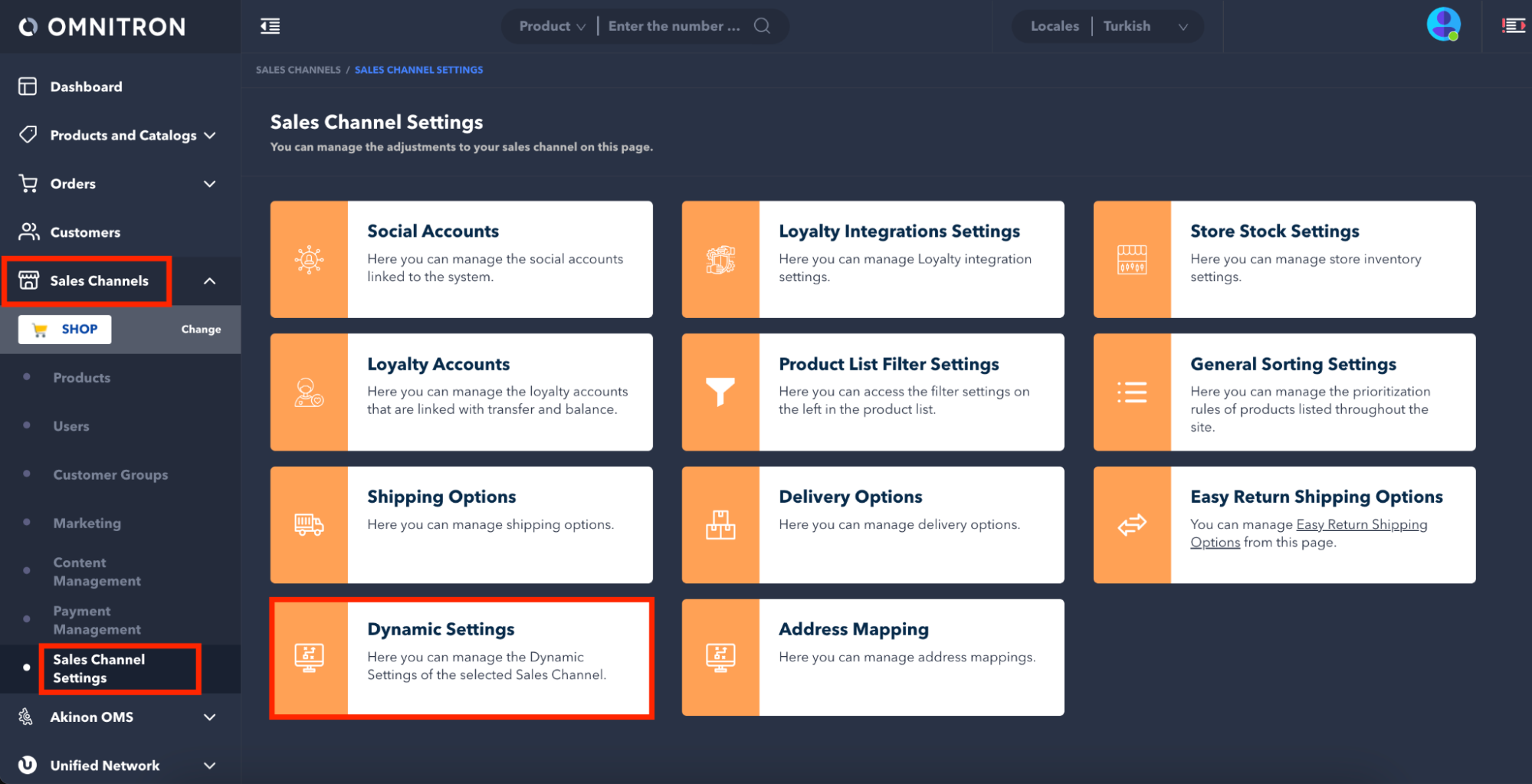Follow the Sales Channels > Sales Channel Settings sidebar and click the Dynamic Settings page.