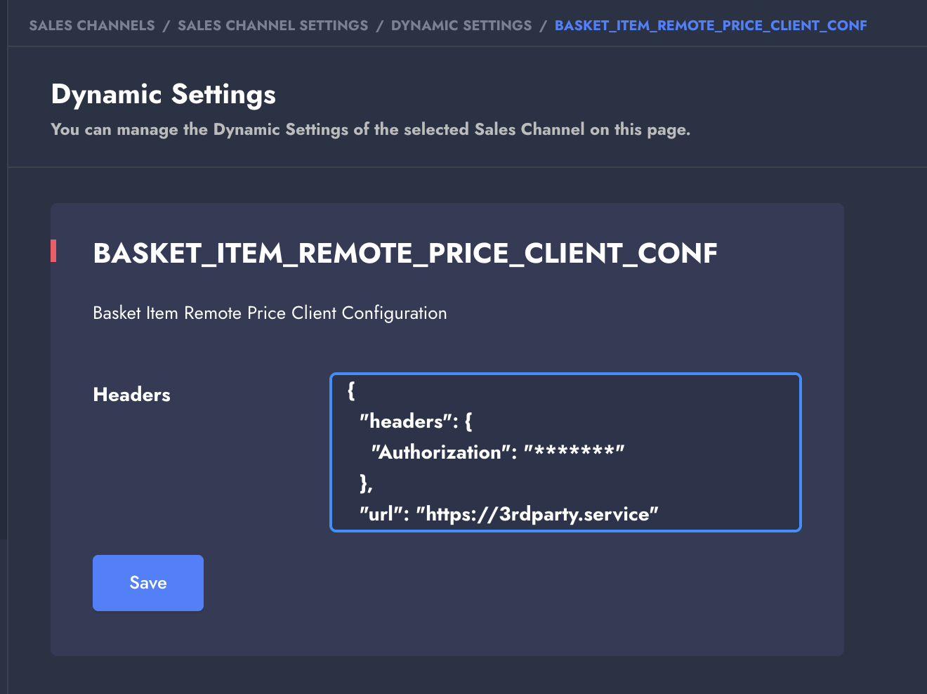 A dynamic configuration named BASKET_ITEM_REMOTE_PRICE_CLIENT_CONF must be defined via Sales Channels > Sales Channel Settings > Dynamic Setting in the admin panel. This configuration must include both a url and headers section: