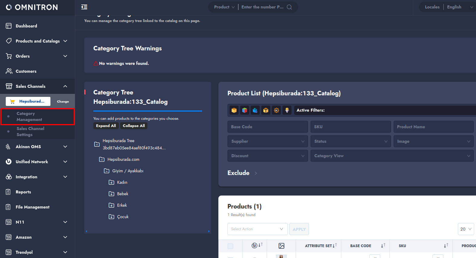 Once the category tree is pulled into Omnitron, it can be viewed by selecting **Hepsiburada** under **Sales Channels**, and then navigating to the **Category Management** section.