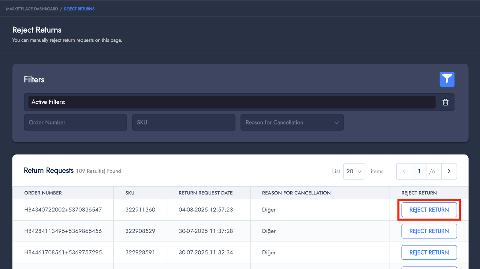 The dashboard data related to the Hepsiburada marketplace application is available on this screen.