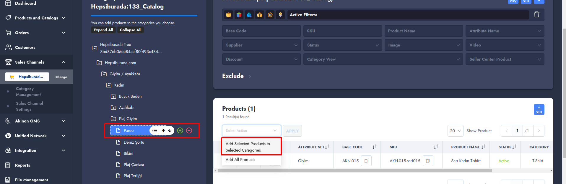 Products must be added to the relevant category tree on the Hepsiburada side. Each product should only be added to one category. Otherwise, an error may occur during submission on Hepsiburada.