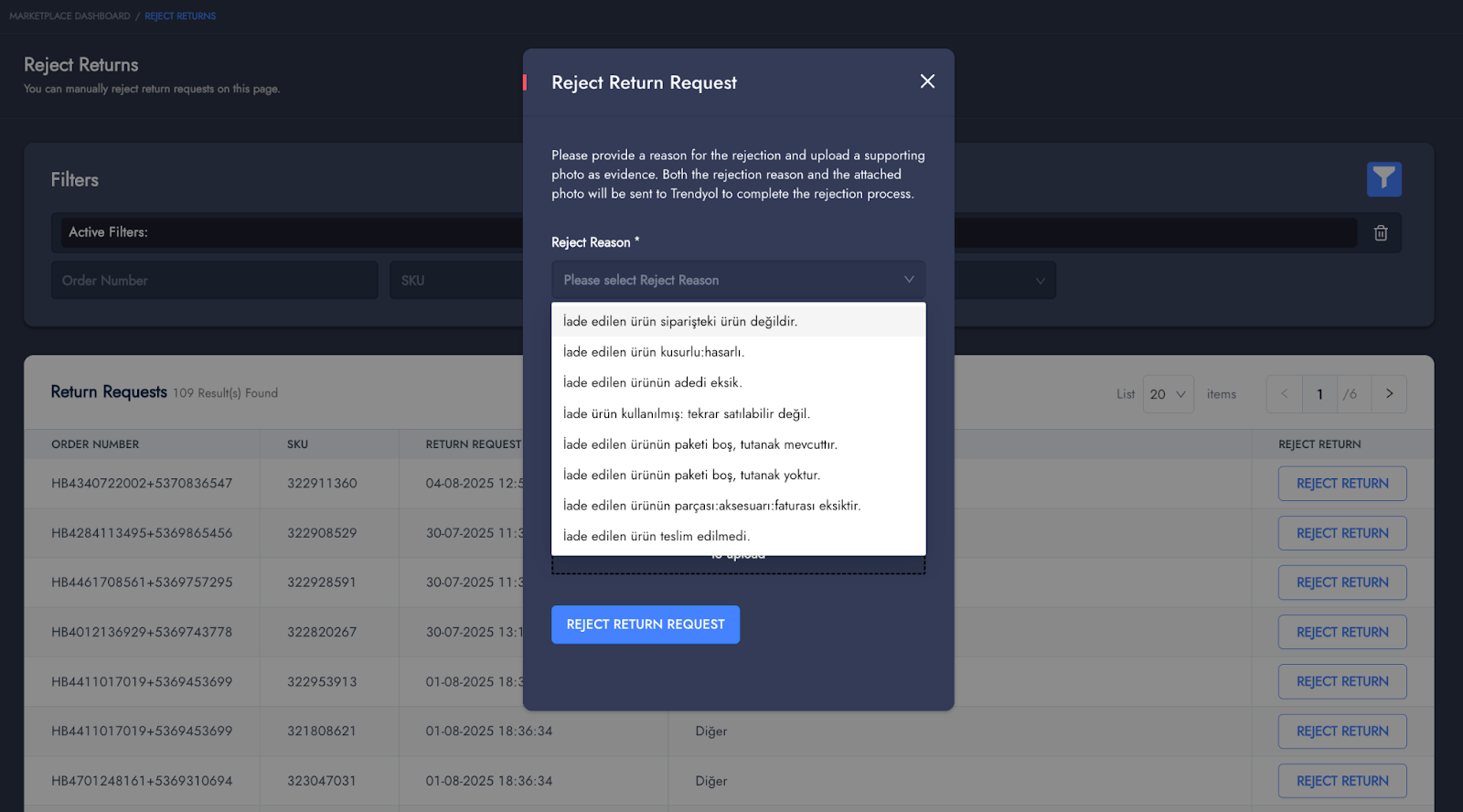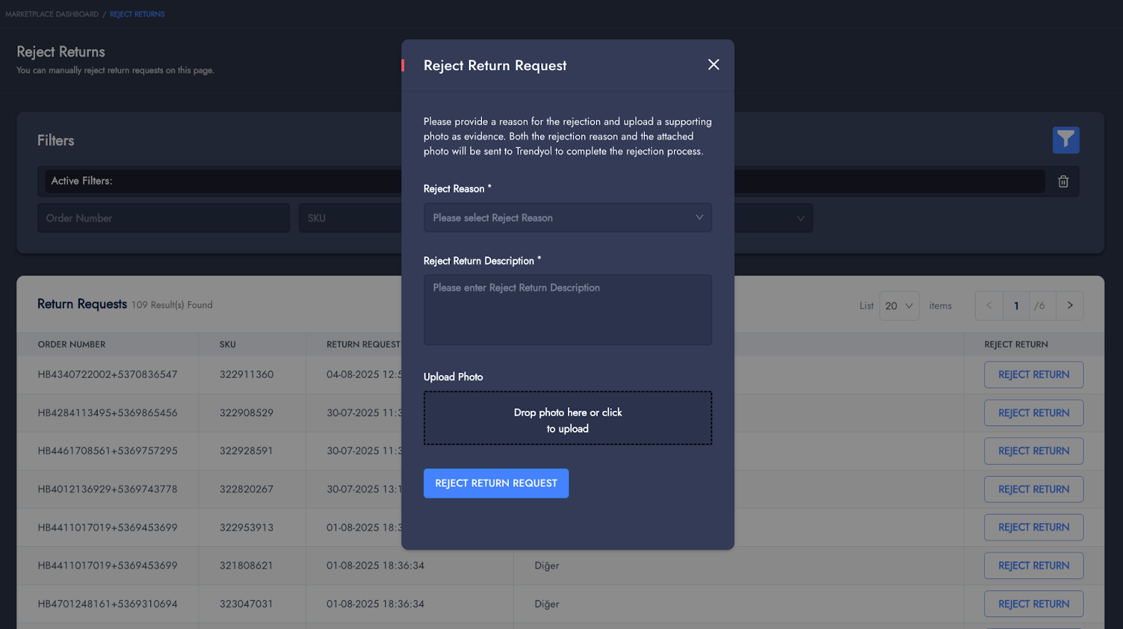 If the requests reviewed on these screens are rejected, the **RejectRefund** flow sends the rejection reason, explanation, and any attached photos to the marketplace.