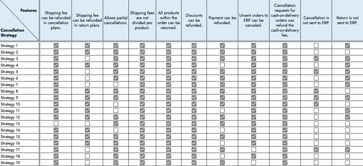 A total of **19 distinct cancellation and return strategies** designed to handle different scenarios of order cancellation, refund, and ERP integration. Each strategy defines specific rules regarding how shipping fees, discounts, payments, and ERP reporting are managed, ensuring that cancellations and returns comply with both business requirements and operational constraints.