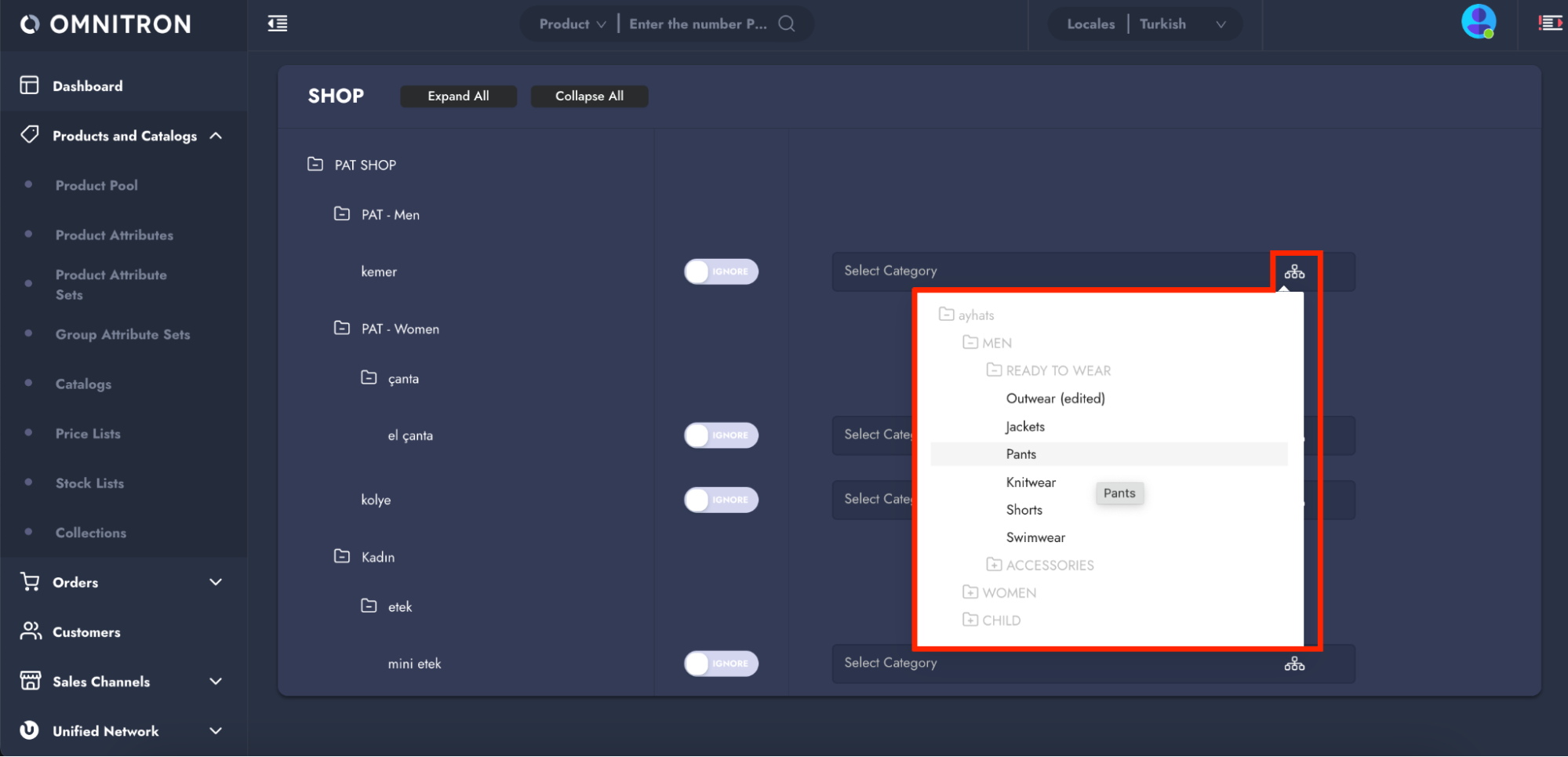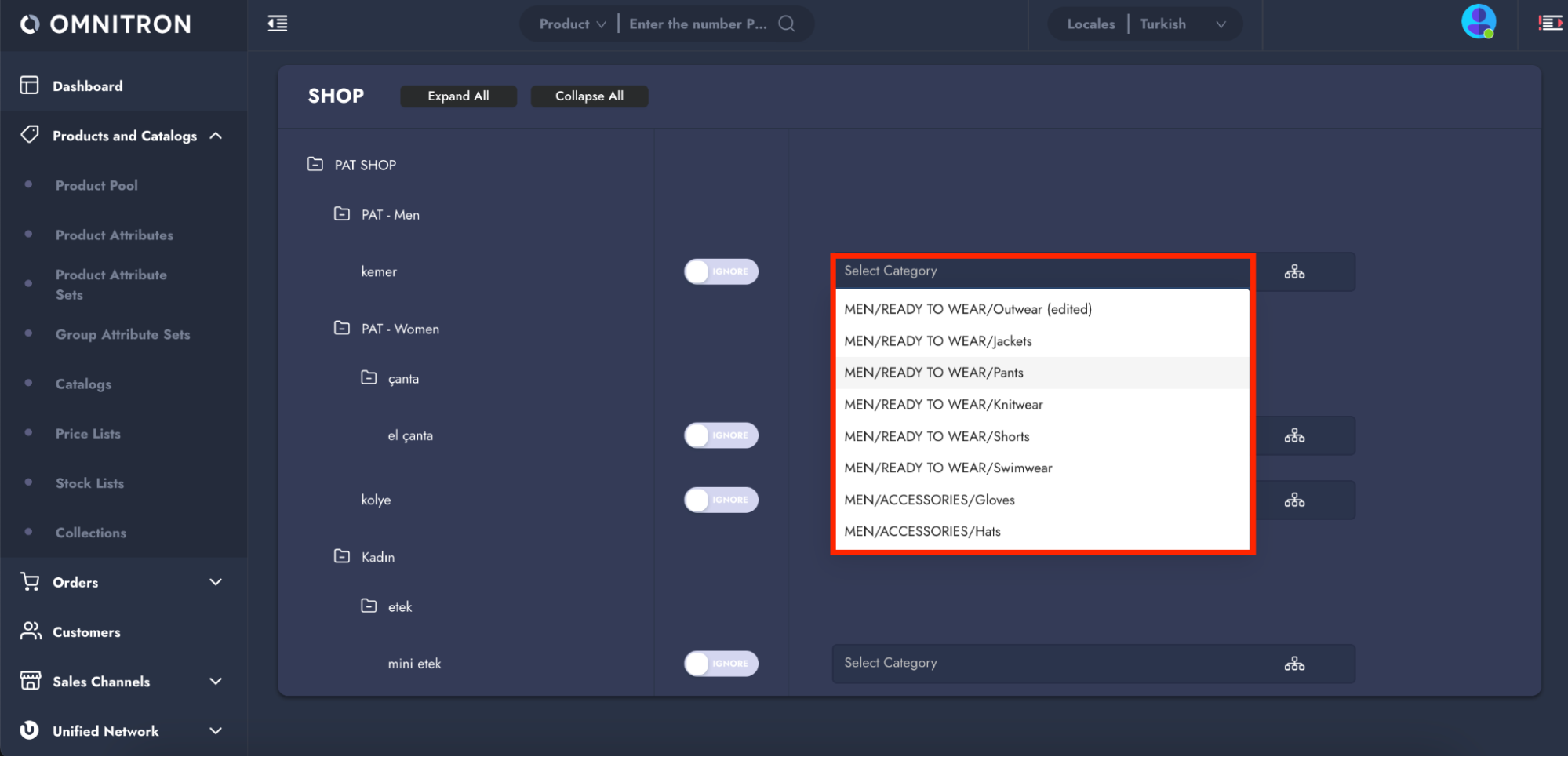 Omnitron’s category management feature is a versatile tool that empowers users to effectively manage product categorization across both shop and marketplace sales channels. This feature ensures that products are organized into the appropriate categories, enhancing visibility, improving navigation, and supporting efficient integration with various sales platforms.
