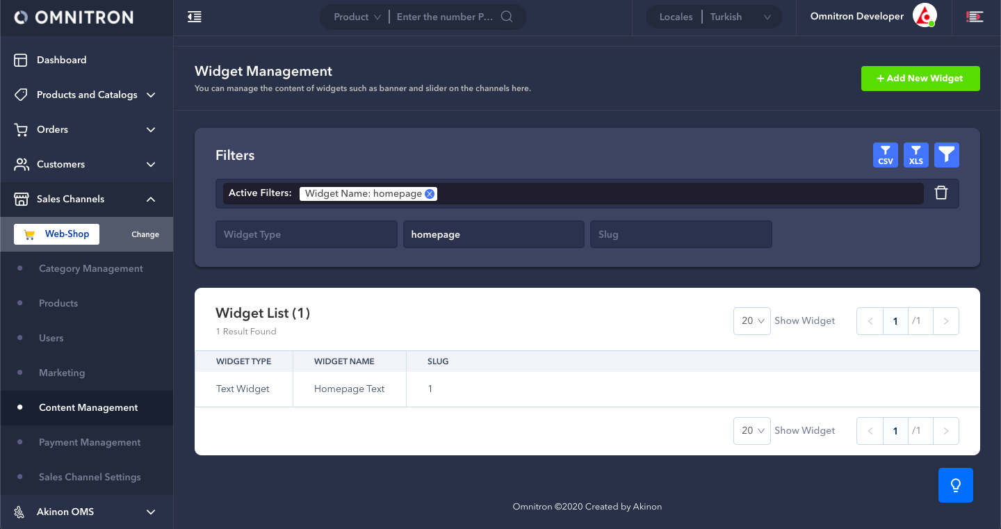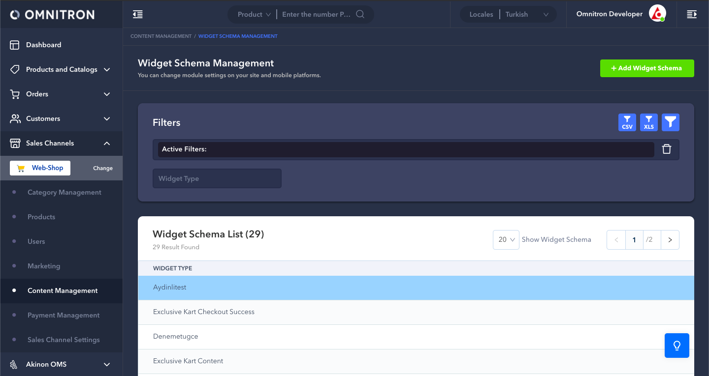 Once the schema is successfully inserted, go to the the Content Management -> Widget Management page and click on the "Add New Widget" button.