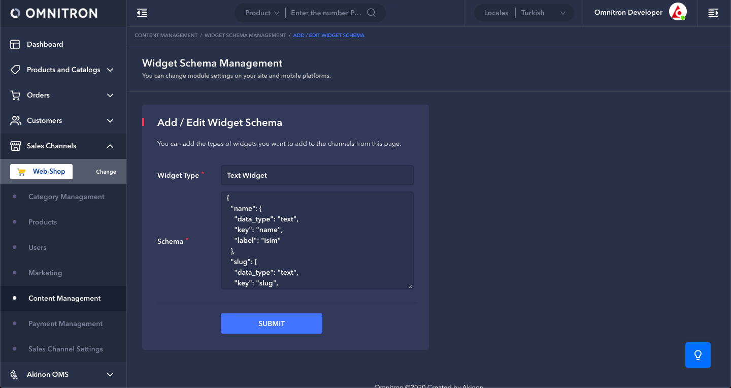 Once the schema is created as desired, go to the Content Management -> Widget Template Management page on Omnitron and click on the "Add Widget Template" button.