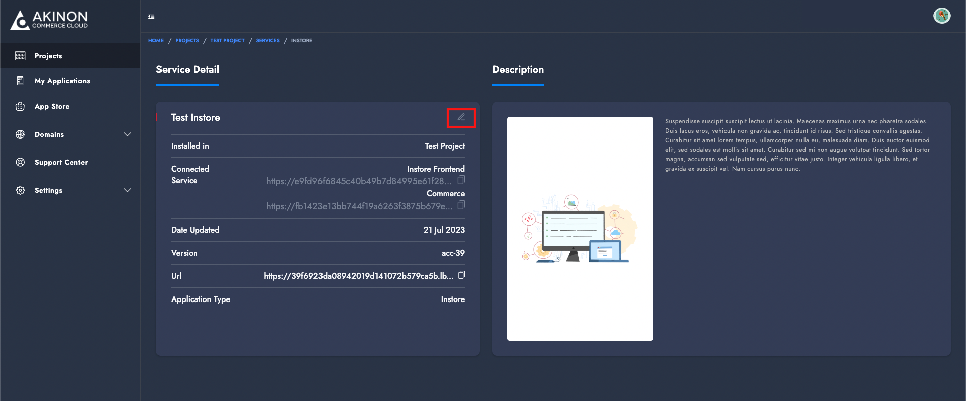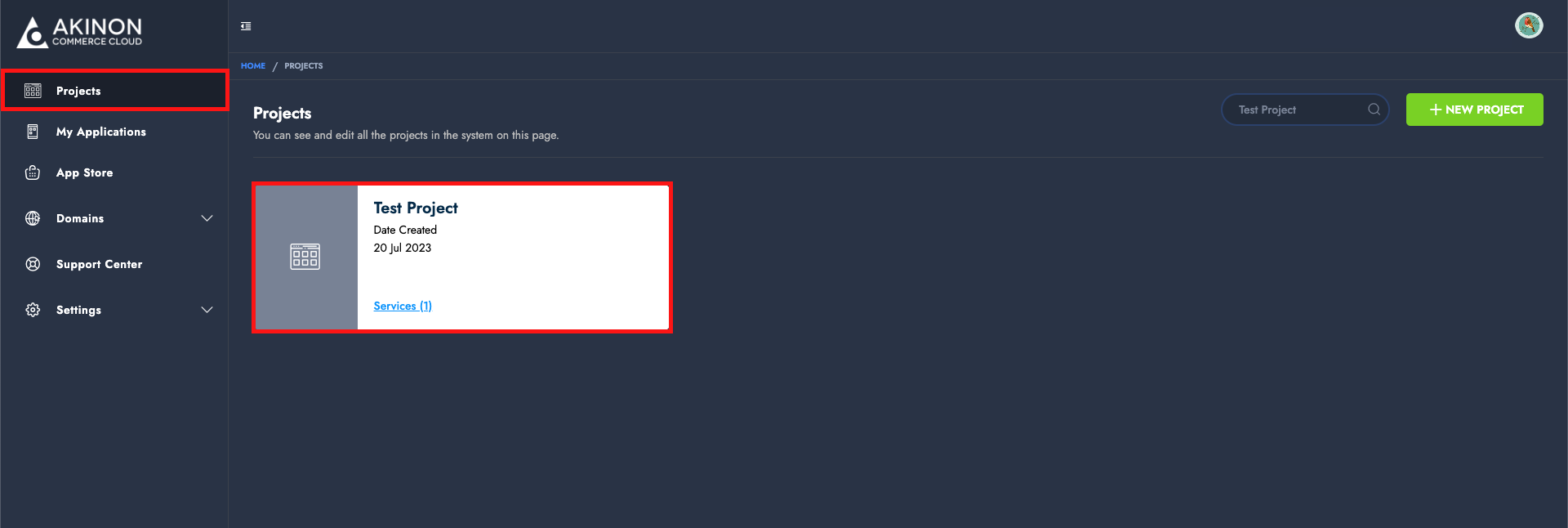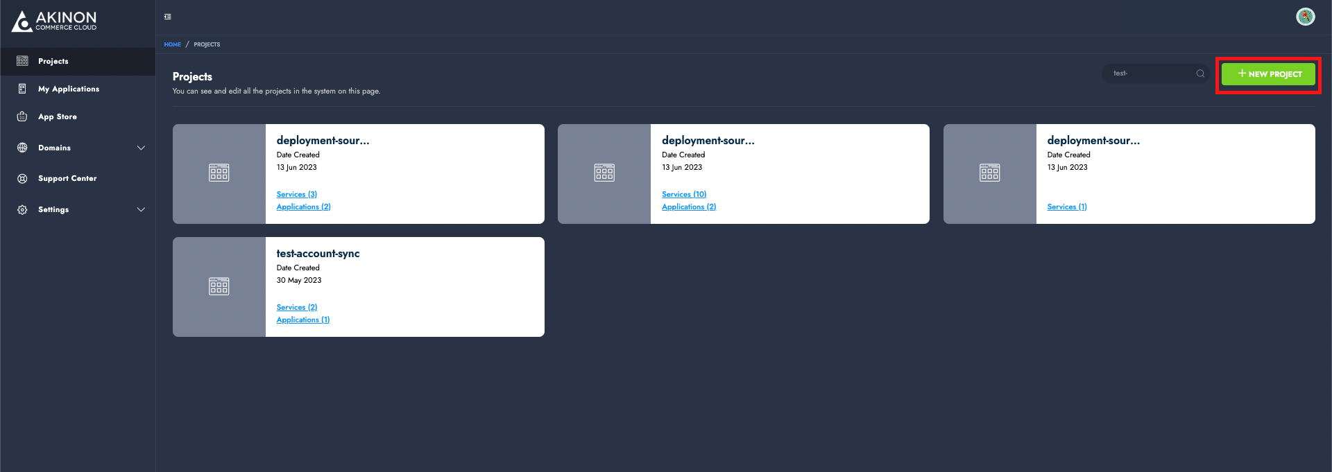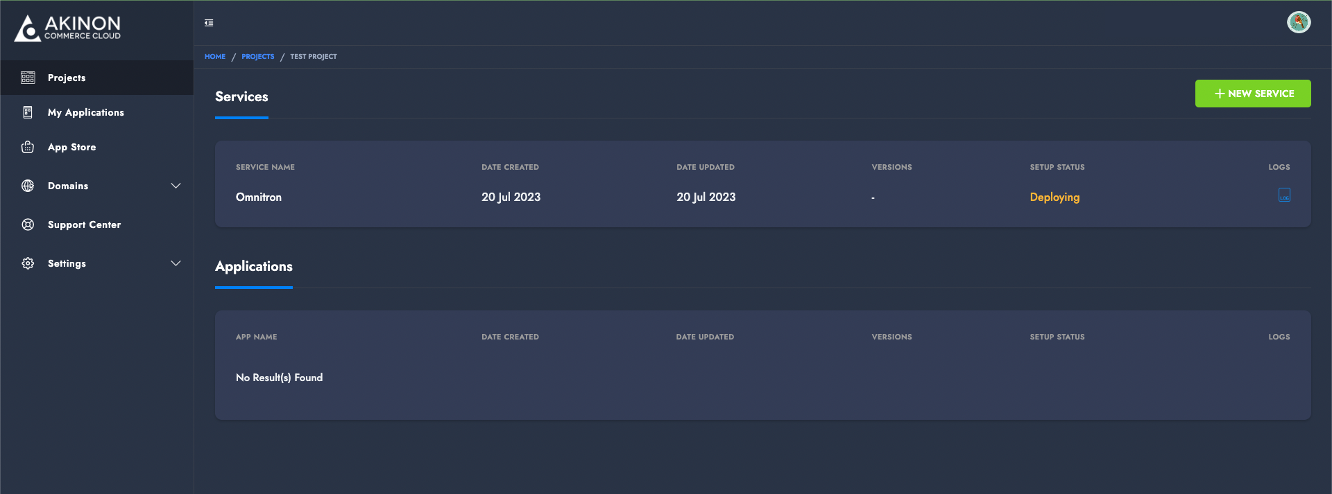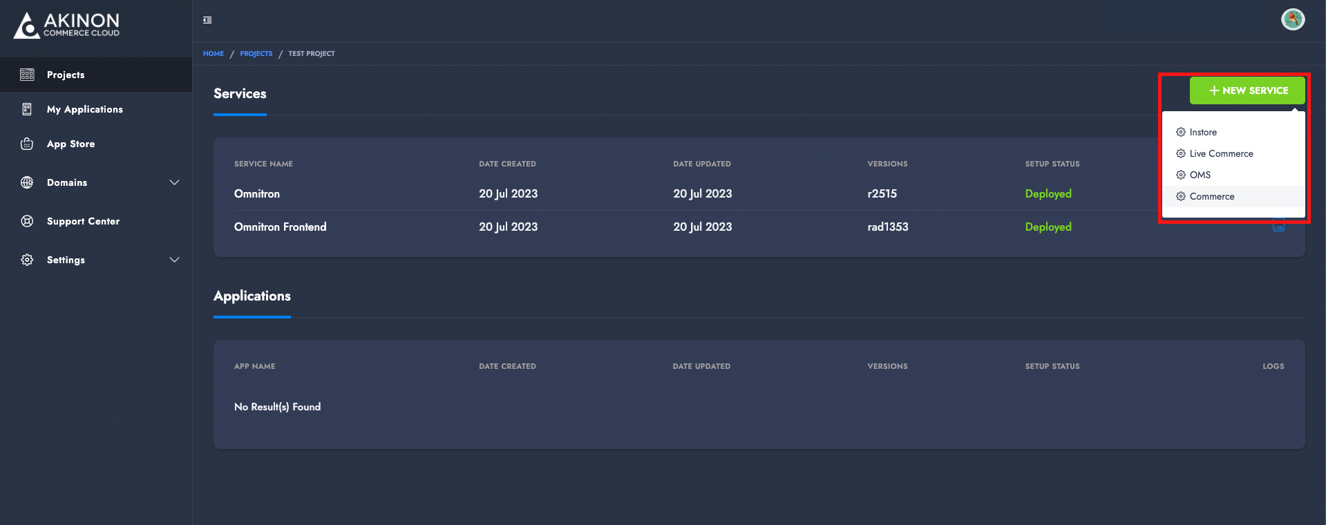 To add new services available in the Akinon ecosystem to their project, click on the + New Service button on the project detail page.