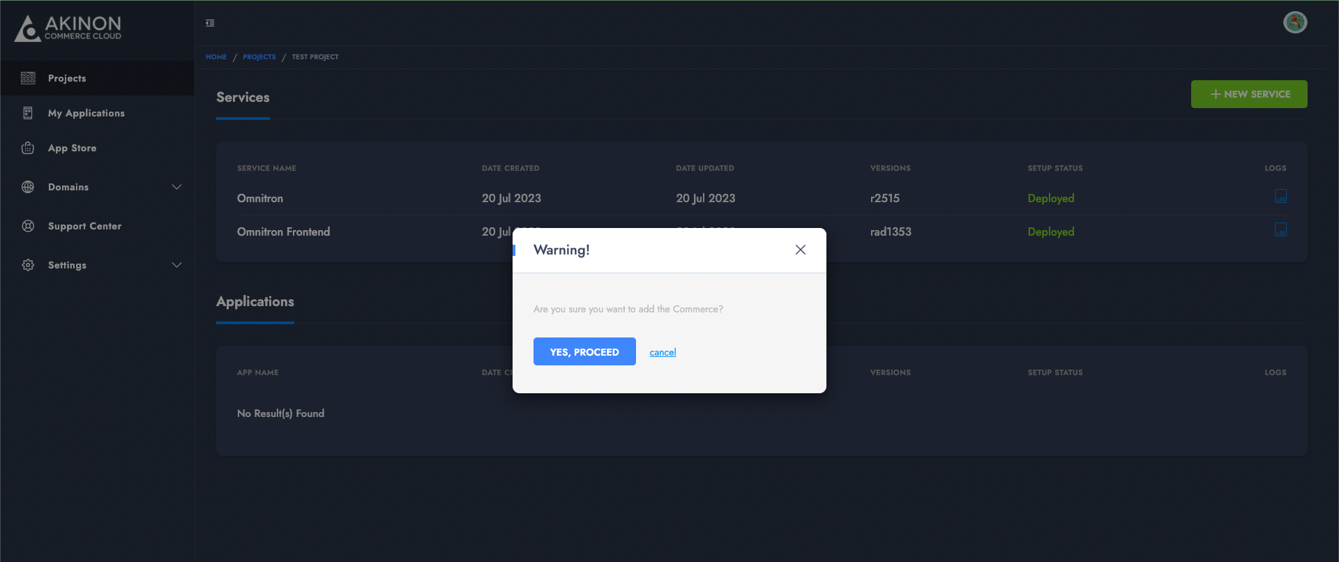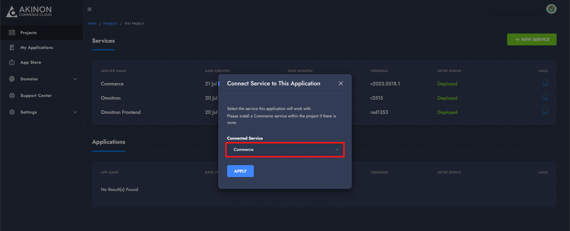 Instore, Live Commerce, OMS, and Commerce services can be automatically added to the project according to the application dependencies. For example, after the Omnitron installations, users can directly add Commerce, OMS, or Live Commerce to their project, but they will be prompted to choose a connected service to add Instore.