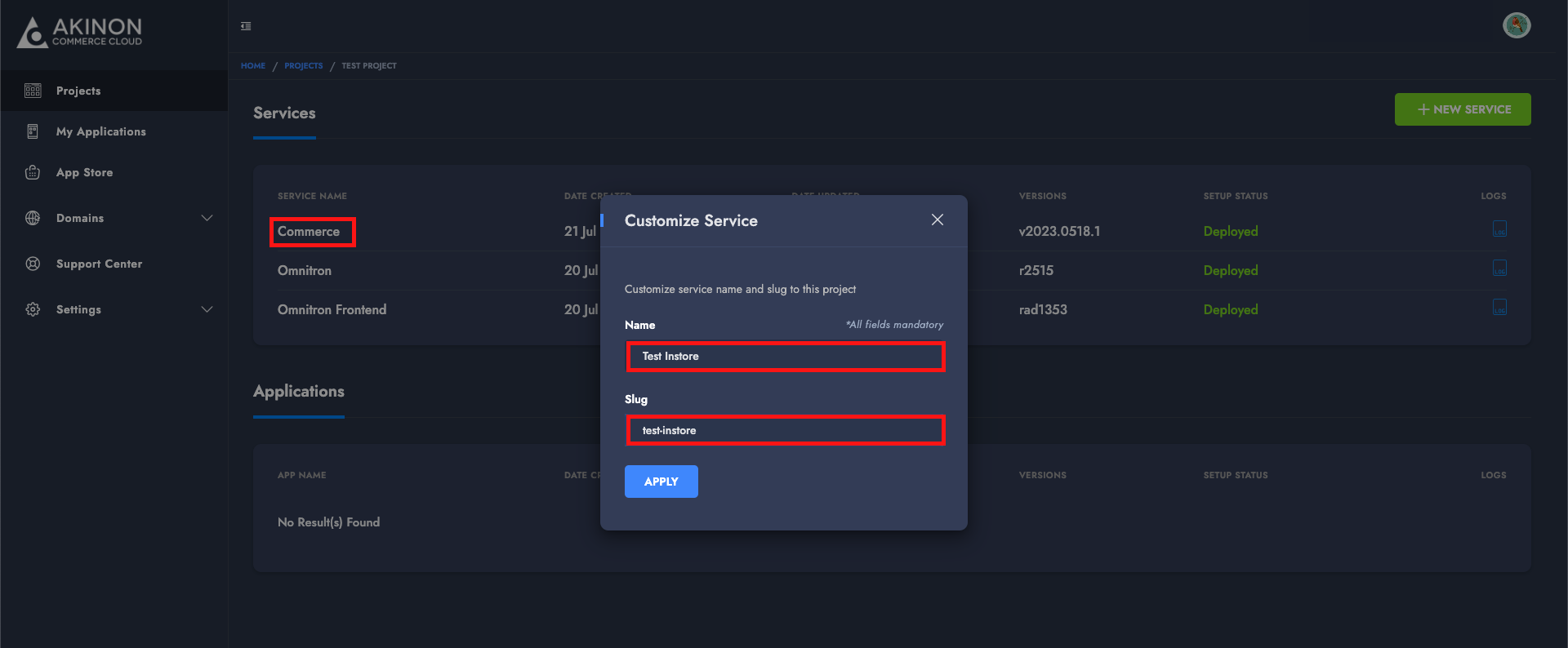 To begin the deployment of the Instore backend, click on the Apply button. Once the backend deployment is initiated, the Instore frontend will automatically start deploying.