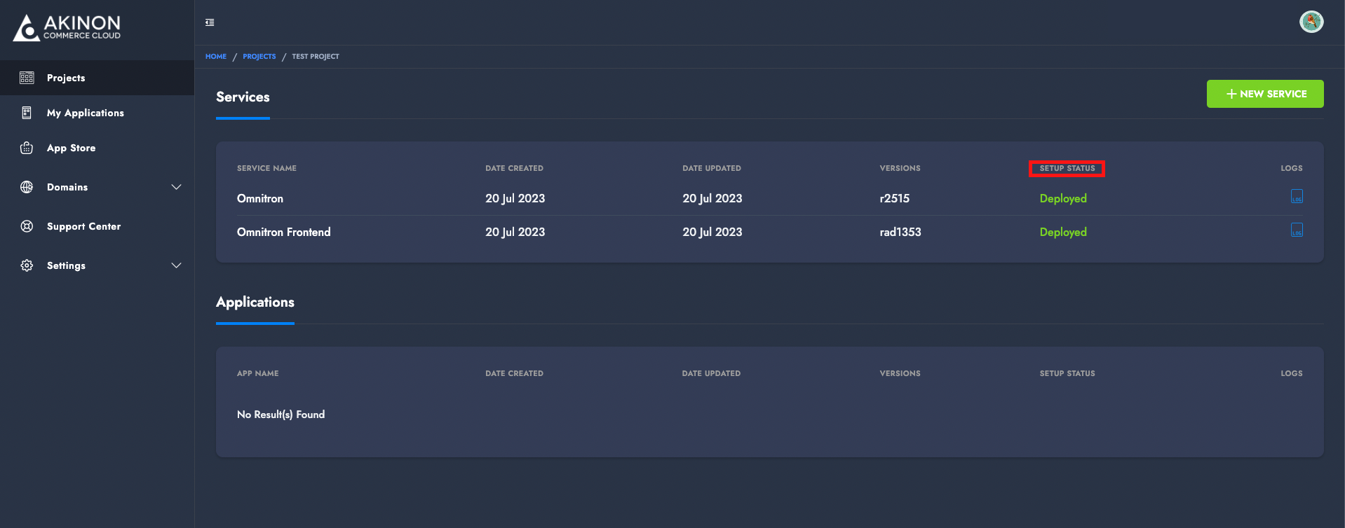 After the Omnitron installations are complete, the setup status of the deployments will be seen as Deployed. At this point, new services and applications can be added to the project.