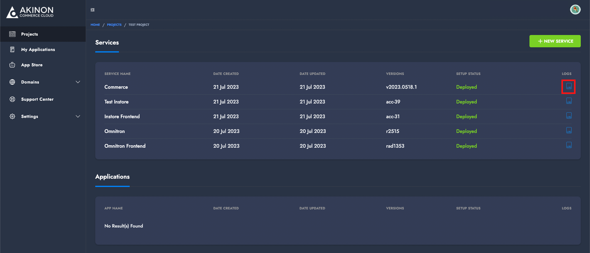 Users can conveniently access the logs of the services in their project by clicking on the icon located in the Logs column.