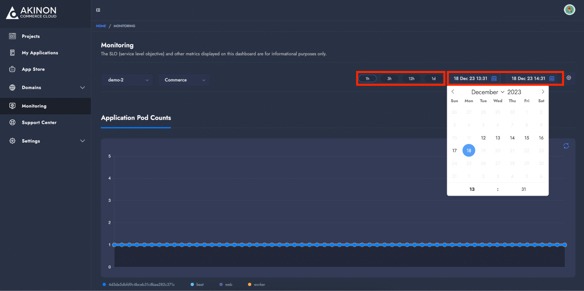 On the right side of the project and application filters, users can select the time interval option to determine the time range for which the data will be displayed. Among the options are time intervals for the last 1, 3, 12 hours, and 1 day. Additionally, users have the flexibility to set a custom time interval according to their preferences.
