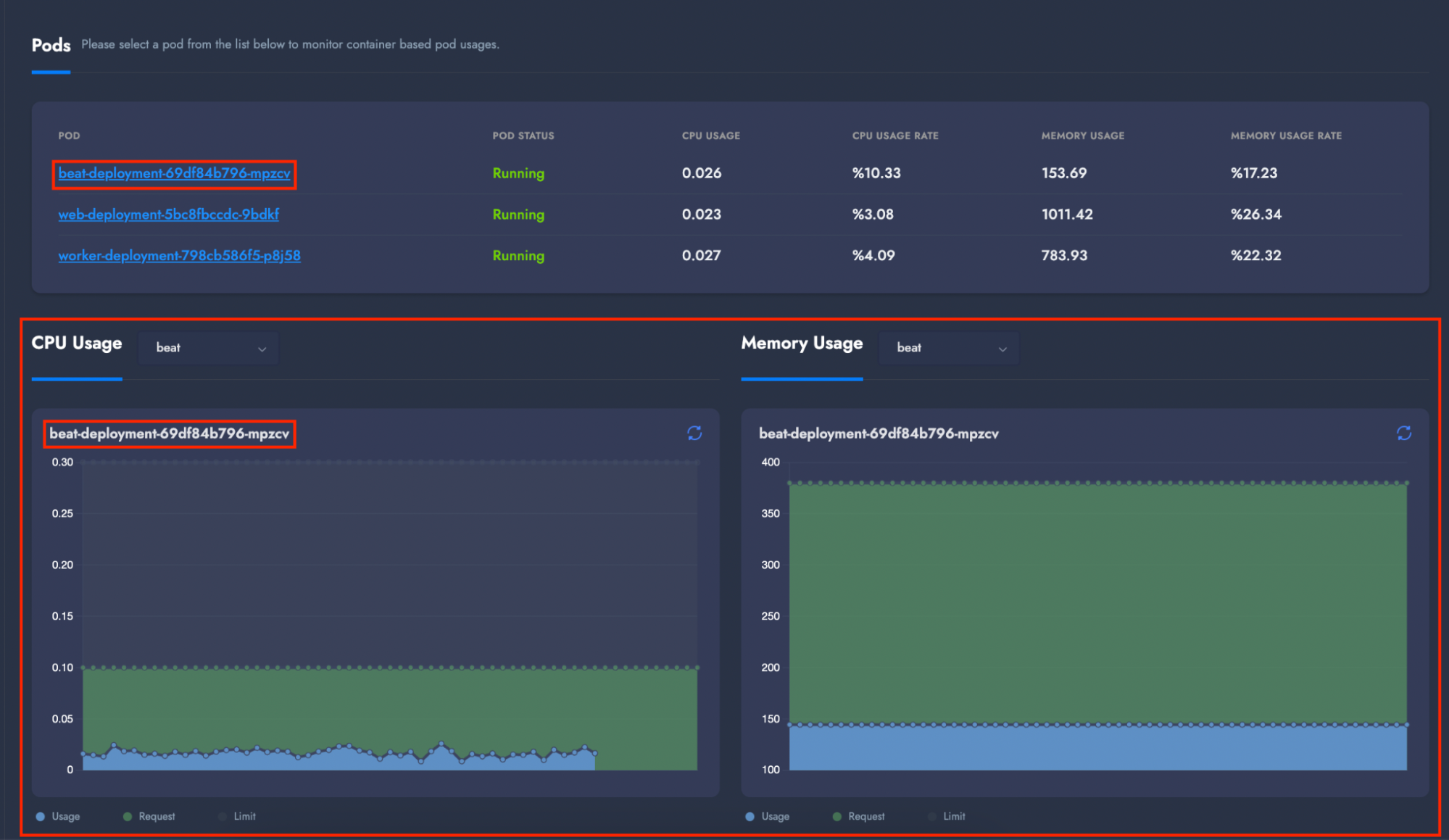 By clicking on any pod in the pod list, users can access container-based CPU & Memory usage information for that specific pod. Below this list, container-based usage graphs for the pod at the top of the list, which is listed for the selected application, are opened by default.