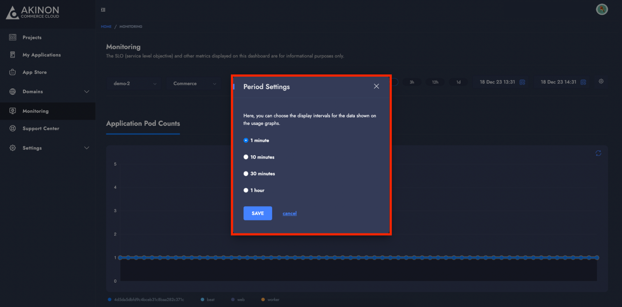 When a custom time interval is selected, the automatic refresh is not performed. In the **Settings** section, in addition to the refresh option, there is another option that determines the time interval for retrieving data. With the **Change Period** option, the period of the data displayed at intervals of 1, 10, 30 minutes, or 1 hour can be adjusted.