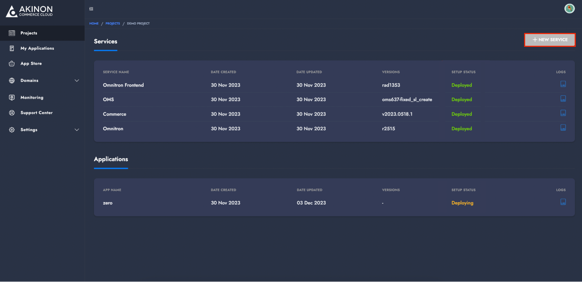 It is not possible to add a new service/application to the project until the deployment of all applications in the selected application package is successfully completed. After successful deployments, a new service can be added to the project by clicking the + New Service button. Services added later to the project are also deployed and ready for use with sample data.