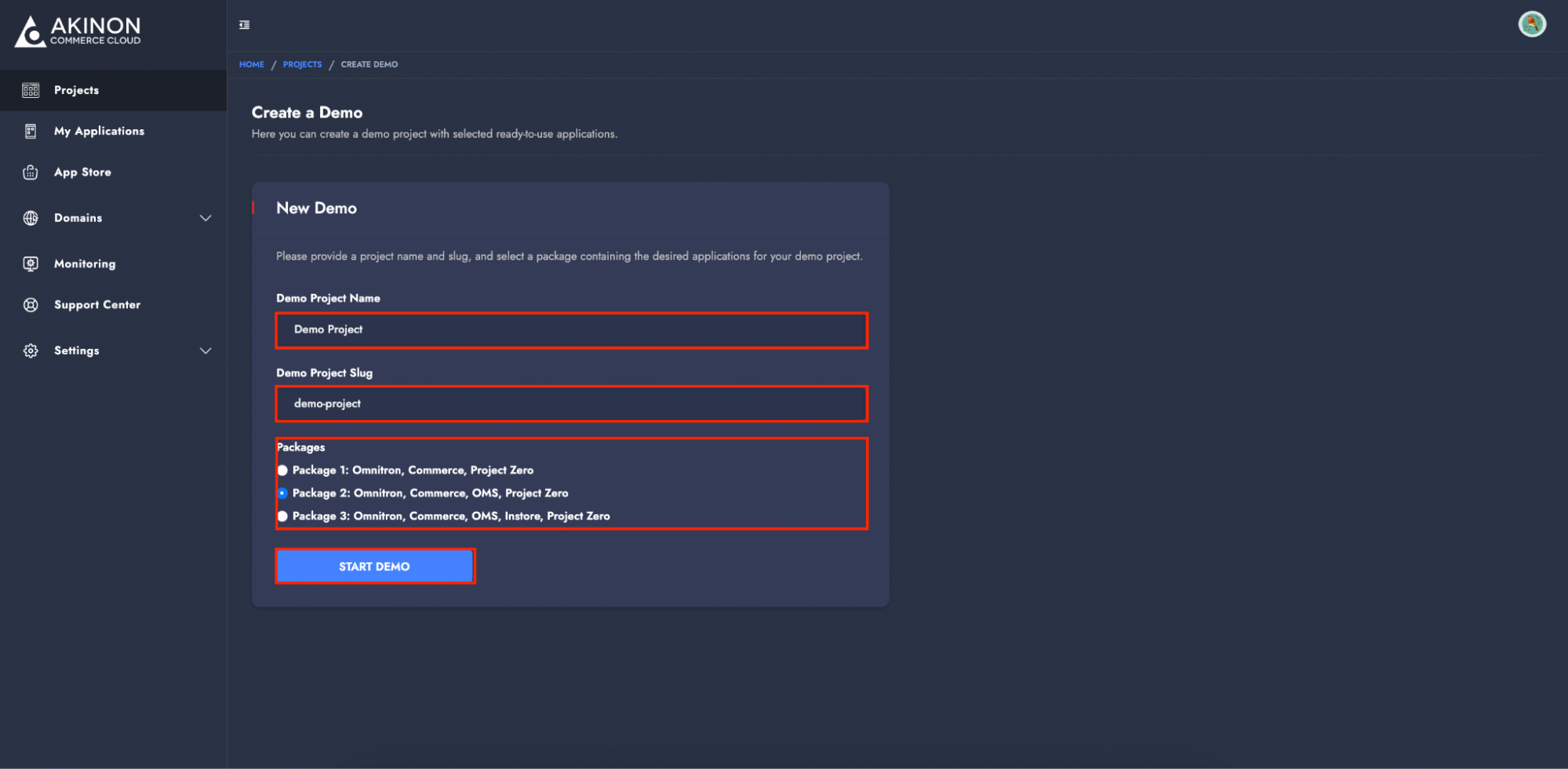 Clicking the + Create Demo button redirects users to the demo project setup detail page. On this page, users need to specify the demo project name and slug, select one of the available application packages. After filling in the necessary fields, clicking the Start Demo button initiates automatic project and application deployments with the specified details on the page.