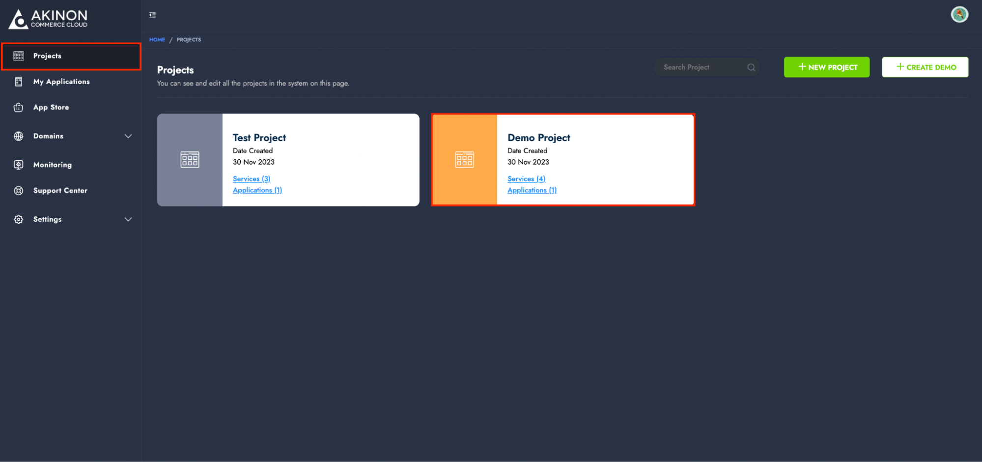 The created demo project is listed on the Projects page and is distinguished from other projects by a different cardbox color.