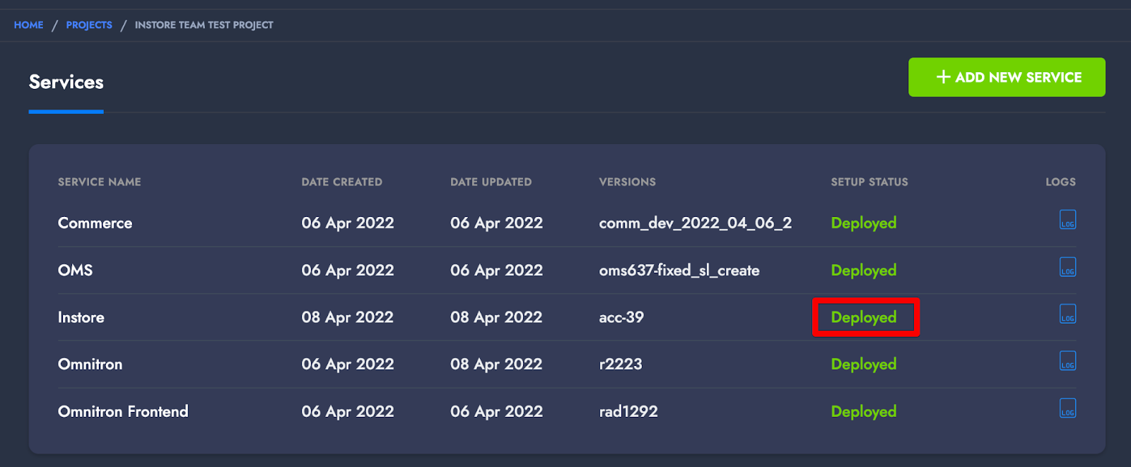 To add the Instore service to an existing or newly created project on the ACC platform, you first need to go to the project detail screen. If you want to create a new Instore project, you need to click on the **Add New Service** button on the project detail screen. When you click the button, a dropdown menu will appear listing the available services on ACC. You can initiate the installation process by selecting the Instore service. To install Instore, the project must have Omnitron, Omnitron FE, and Commerce services.