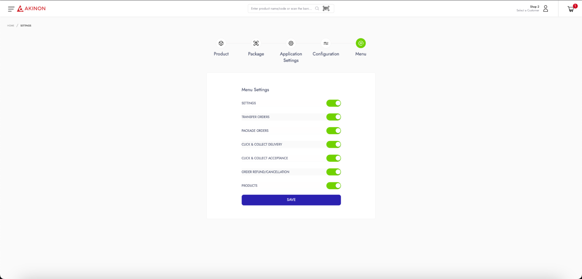 The settings of Instore, which are completed through ACC, can also be configured from the screens located under the **Settings** section in the left menu of the Instore user panel. Through these settings, the desired functions of Instore can be enabled, Instore pages that store employees want to use can be made visible, and visually, Instore can be customized. In addition to the settings screens in Omnitron, there are two extra settings screens named **Product** **Settings** and **Package Settings**.