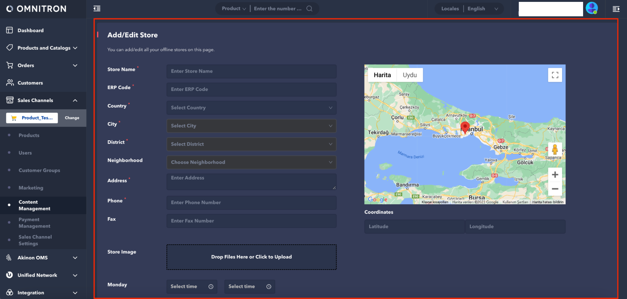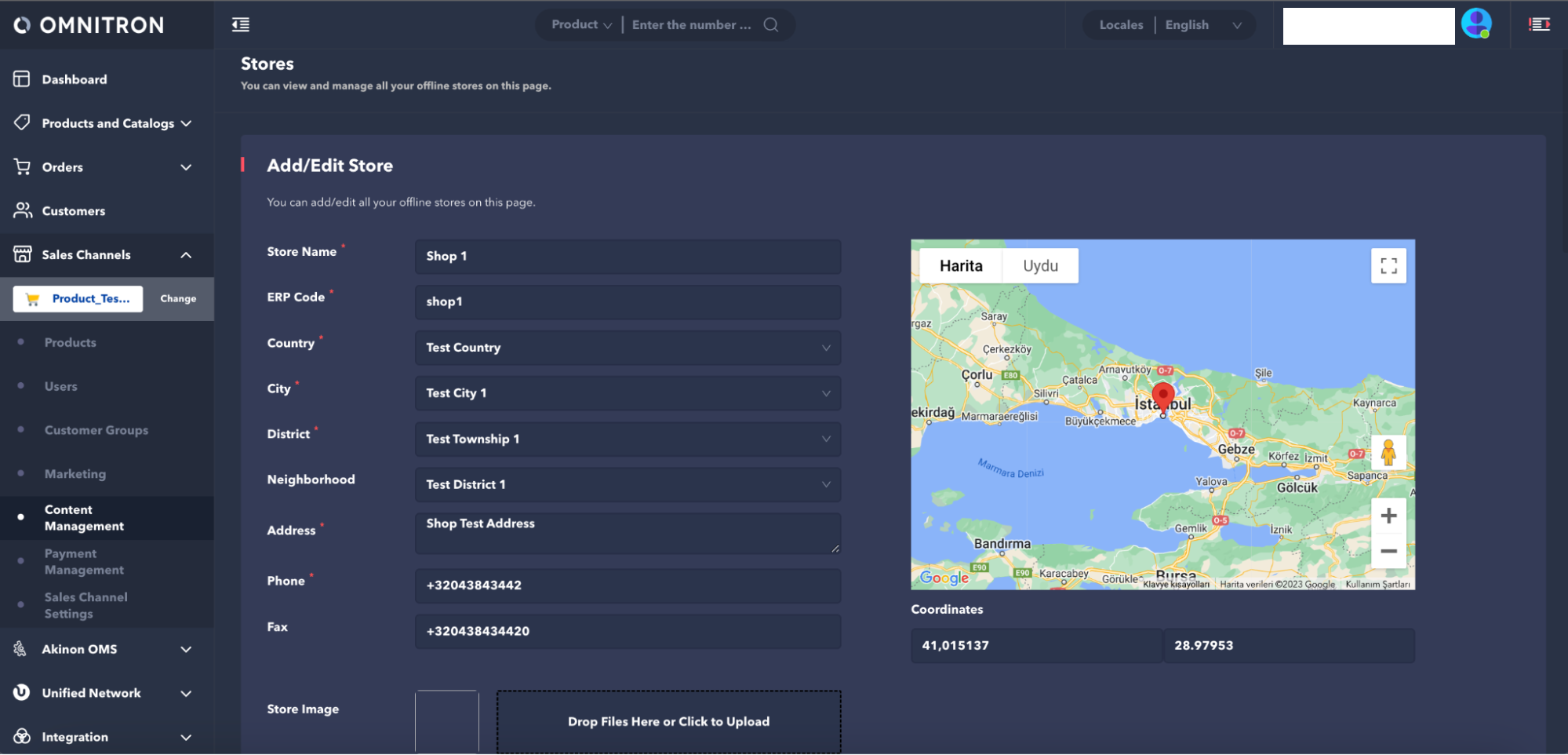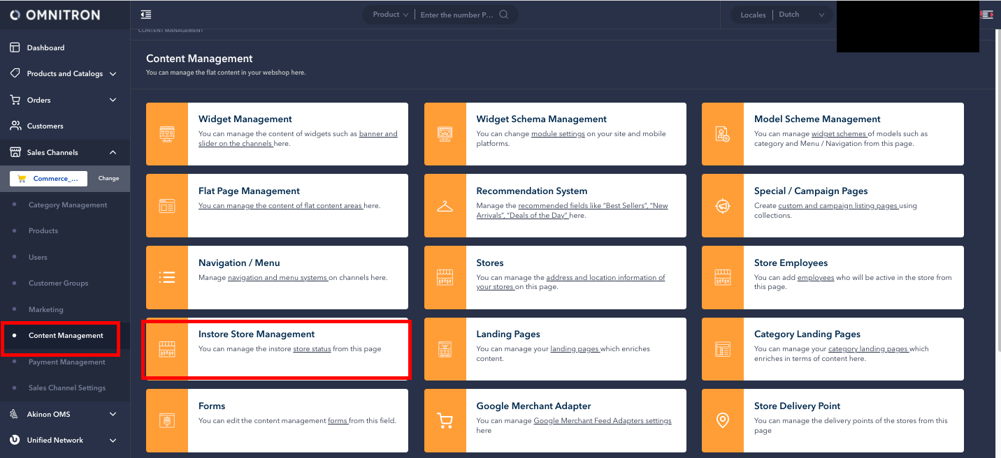 Adding and managing the stores that are desired to be displayed in the Instore application is carried out on Omnitron. To add a store to Instore, it is necessary to create stores on the sales channel connected to Instore in Omnitron first. This process can be performed using the Content Management > Stores screen in Omnitron.