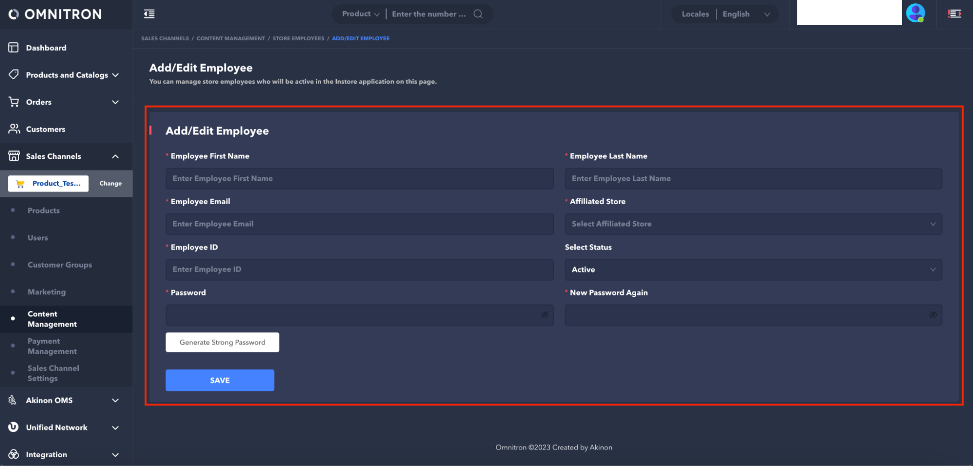 The creation and management of personnel accounts associated with stores in the Instore application are carried out through the **Content Management > Store Employees** screen on Omnitron.