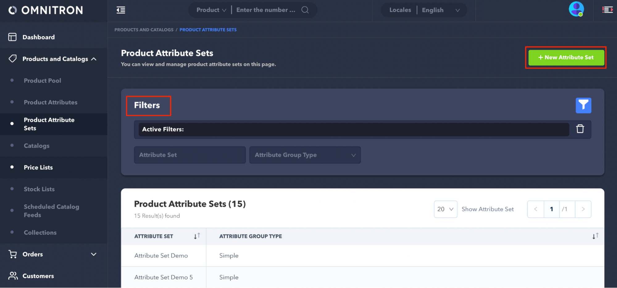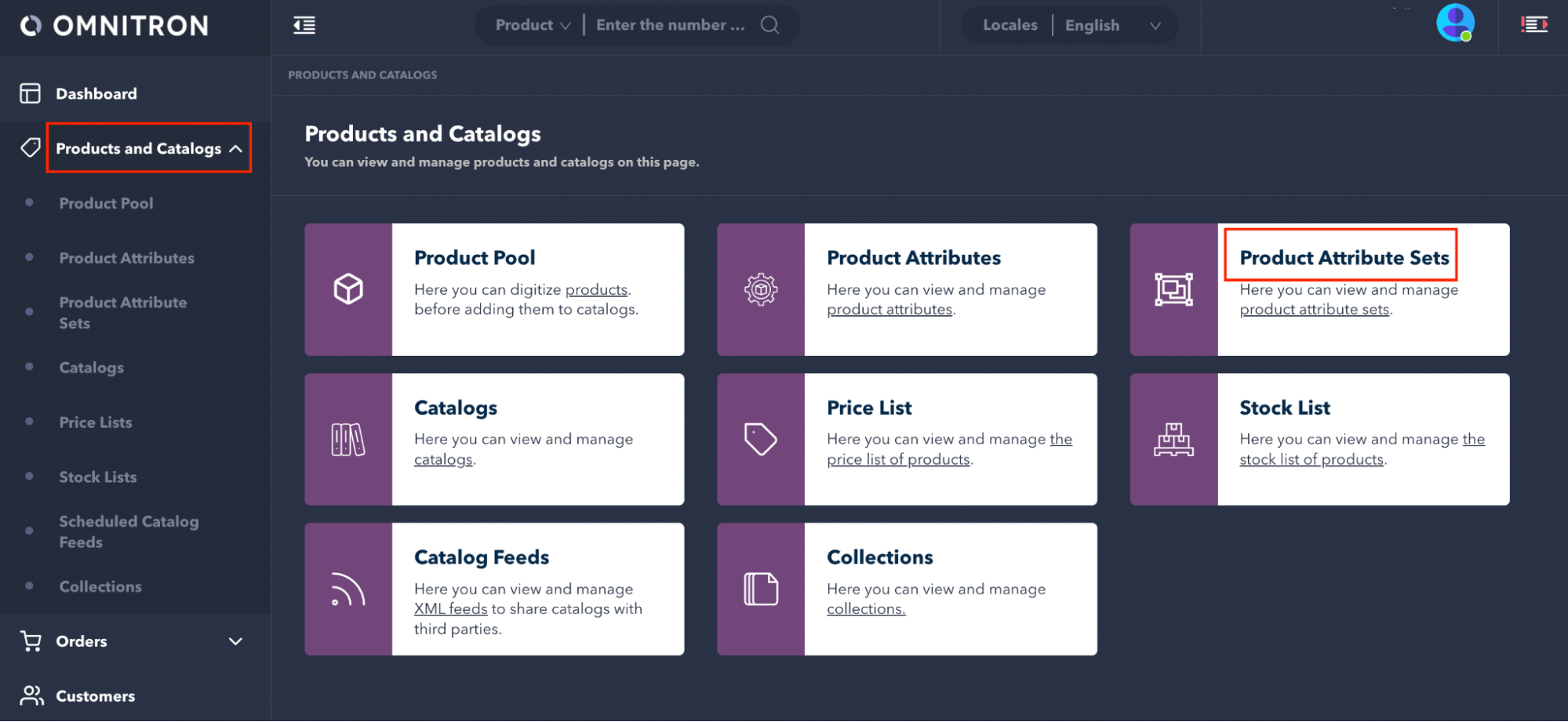 In Omnitron, navigate to Products and Catalogs > Product Attribute Sets from the left-hand menu.