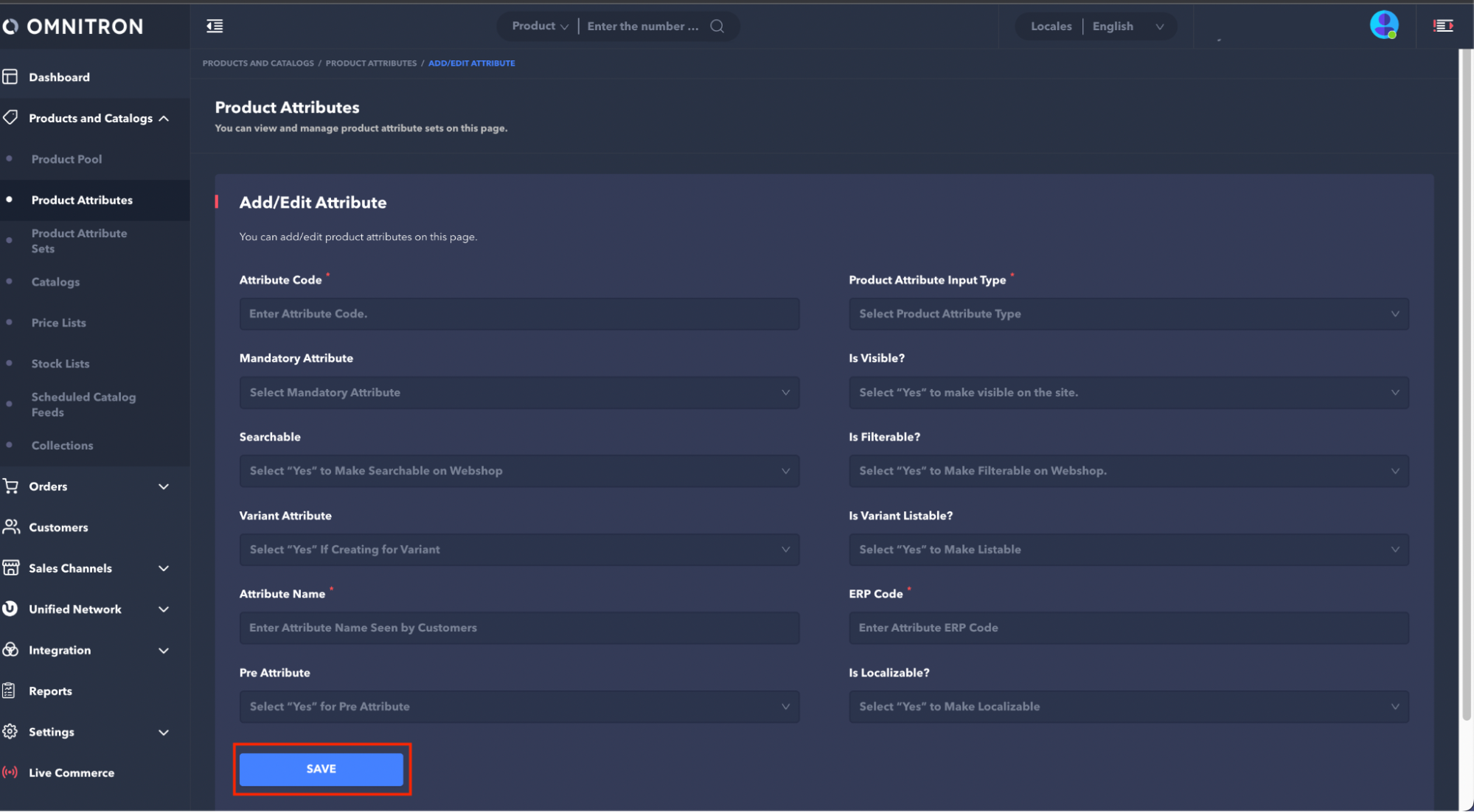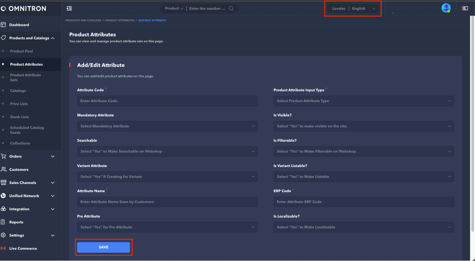 Is Localizable?: If Omnitron supports multiple languages, attributes are generated for the main language. To define attributes for other languages, select the relevant language from the Locales field in the upper right of the Omnitron interface.