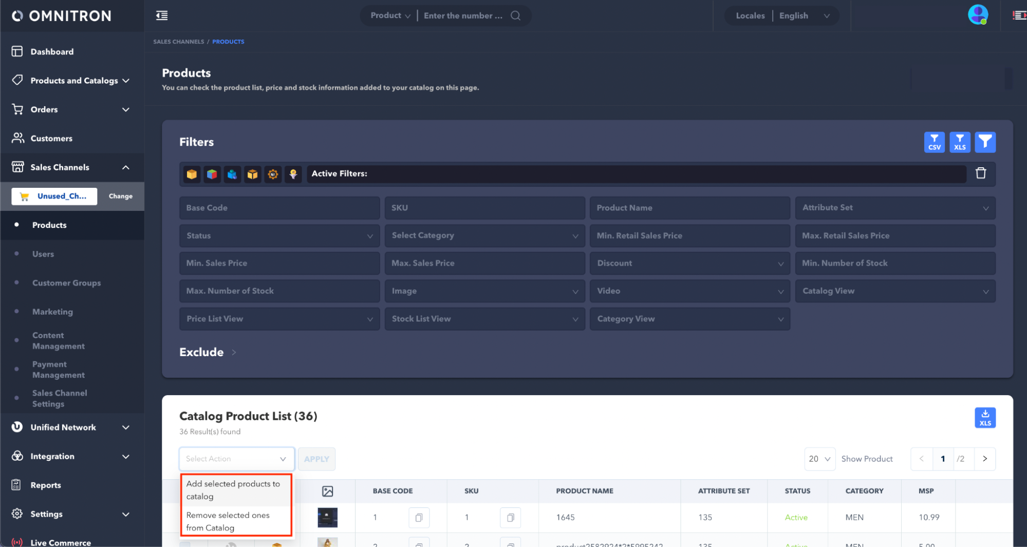 * In the product list, users can use the **Select Action** dropdown to either perform the **Add Selected Products to Catalogs** or **Remove Selected Ones From Catalog** actions for the listed items. The same actions can also be executed on the **Products & Catalogs > Catalogs > Product List** page.<br>
