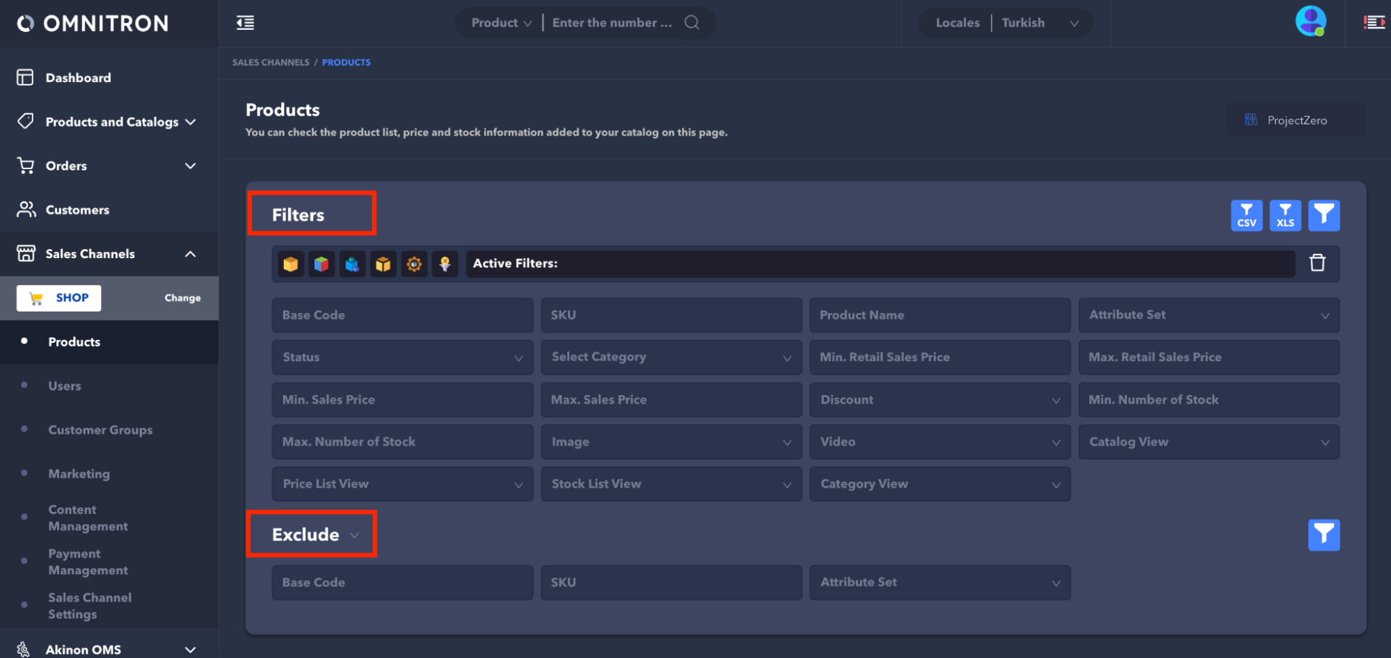 * On the **Products** page, the include and exclude filter panel and the list of existing products are listed.<br>