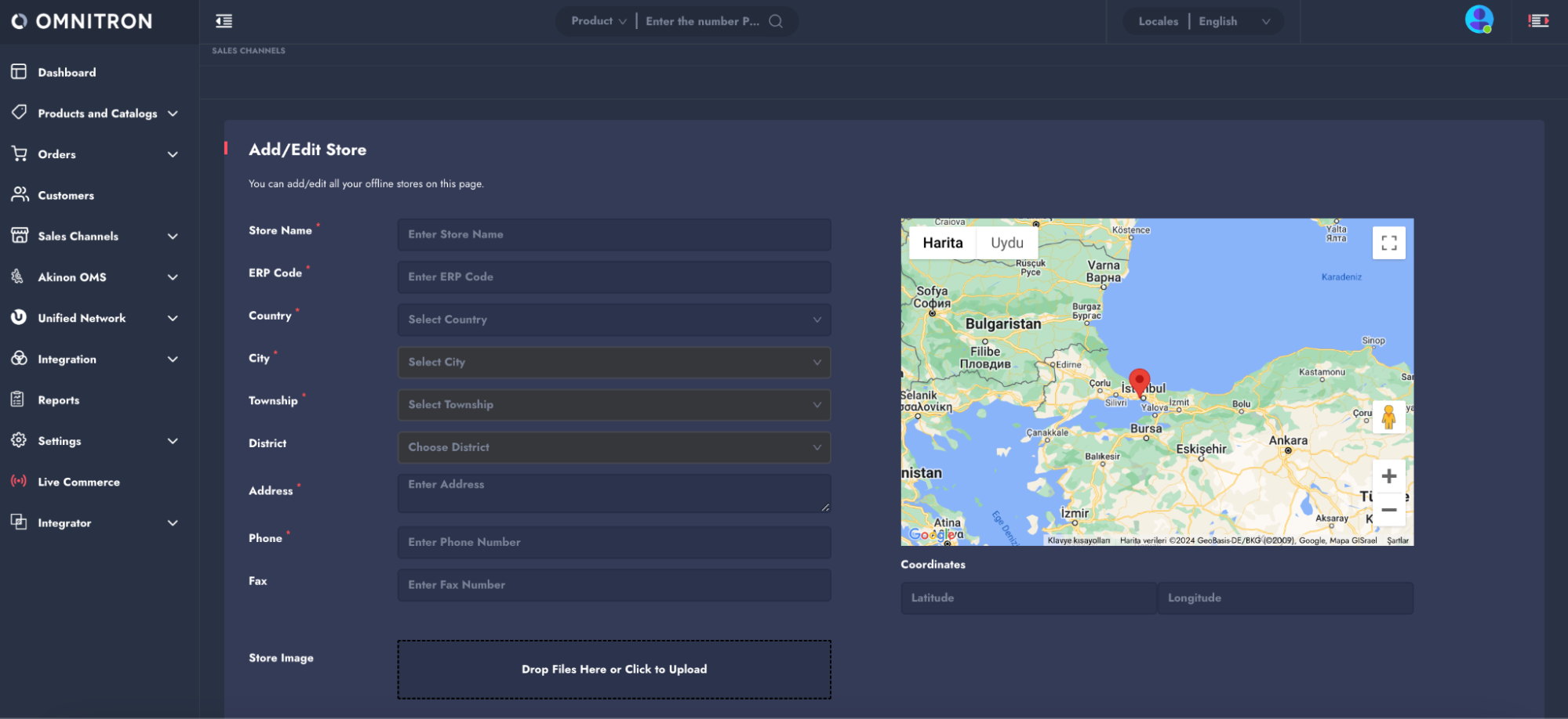 * **Coordinates:** Hold and slide the map indicator to mark the location of the map or manually enter the coordinates in the related fields. If the latter option is used, the map indicator is automatically moved to the specified location.