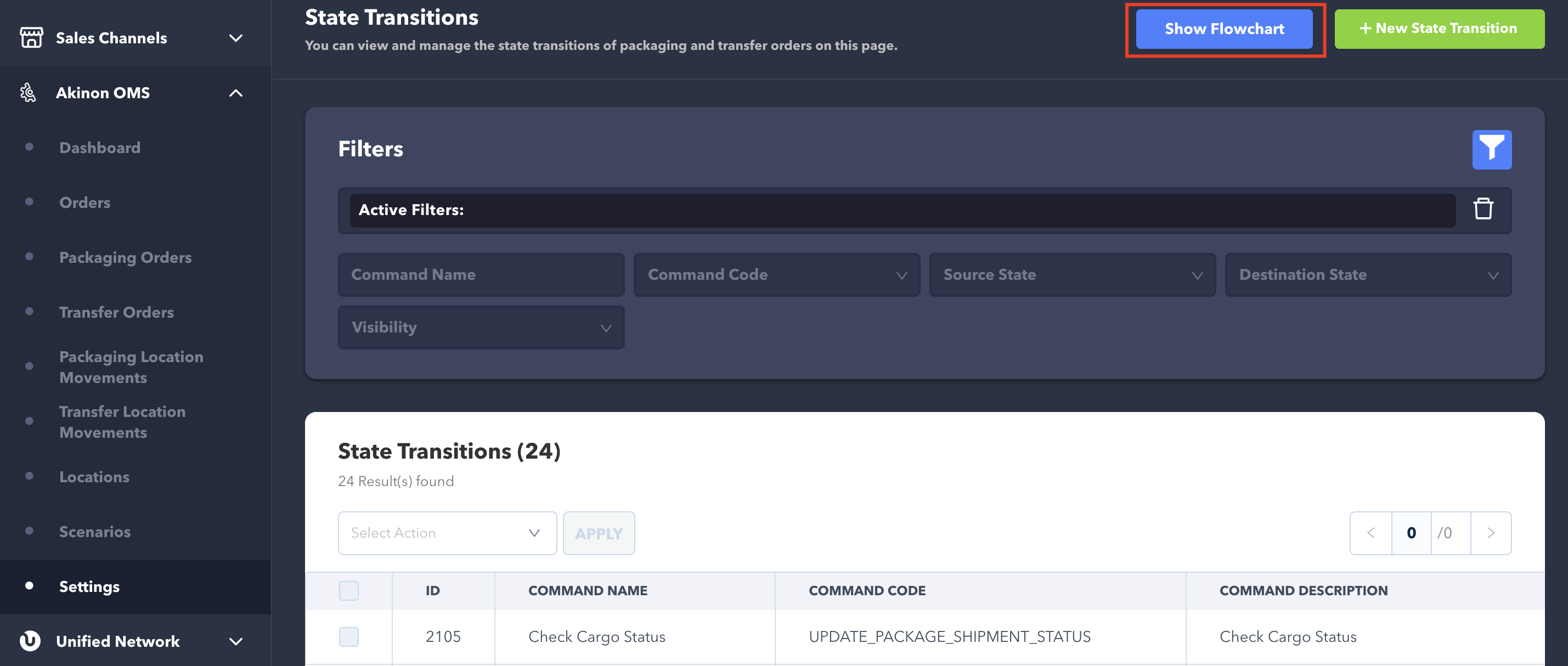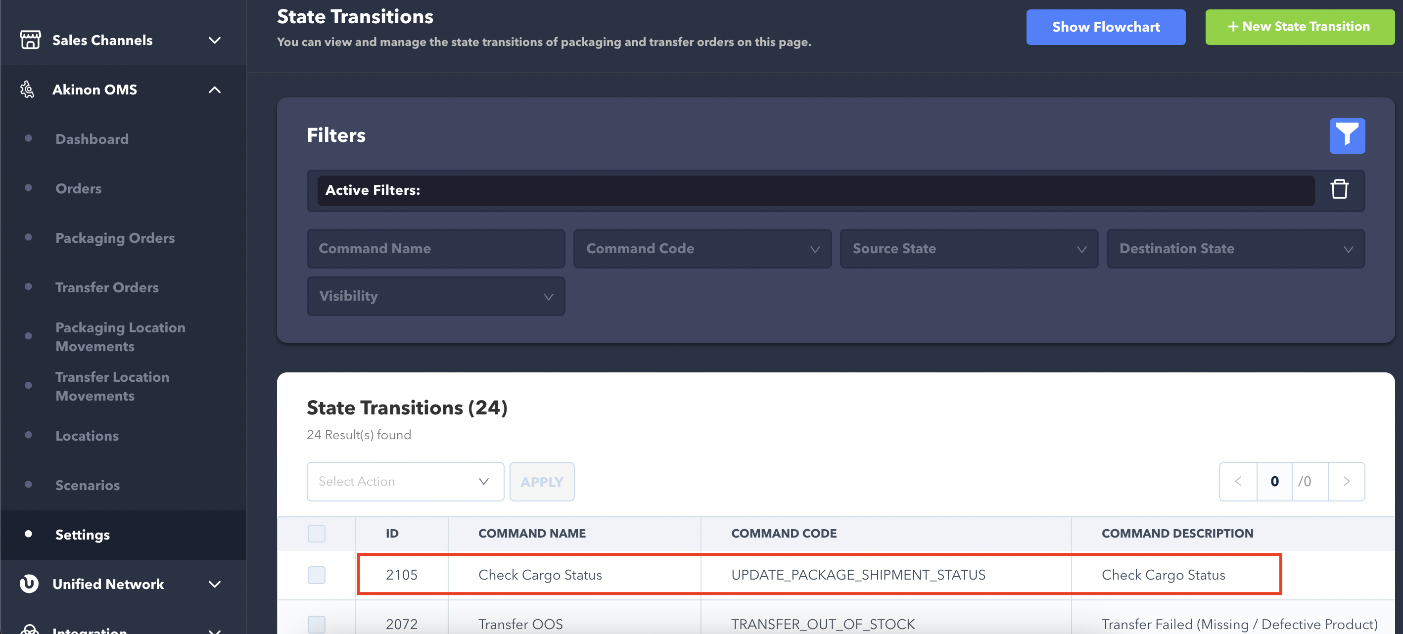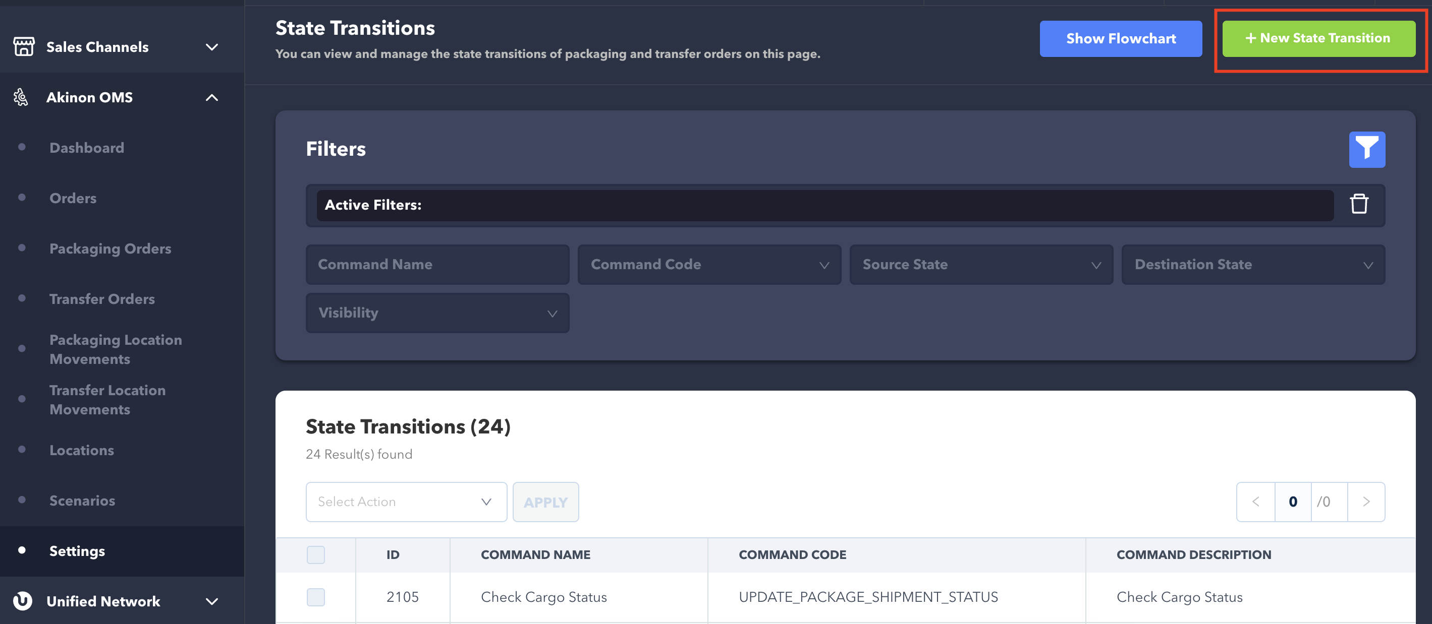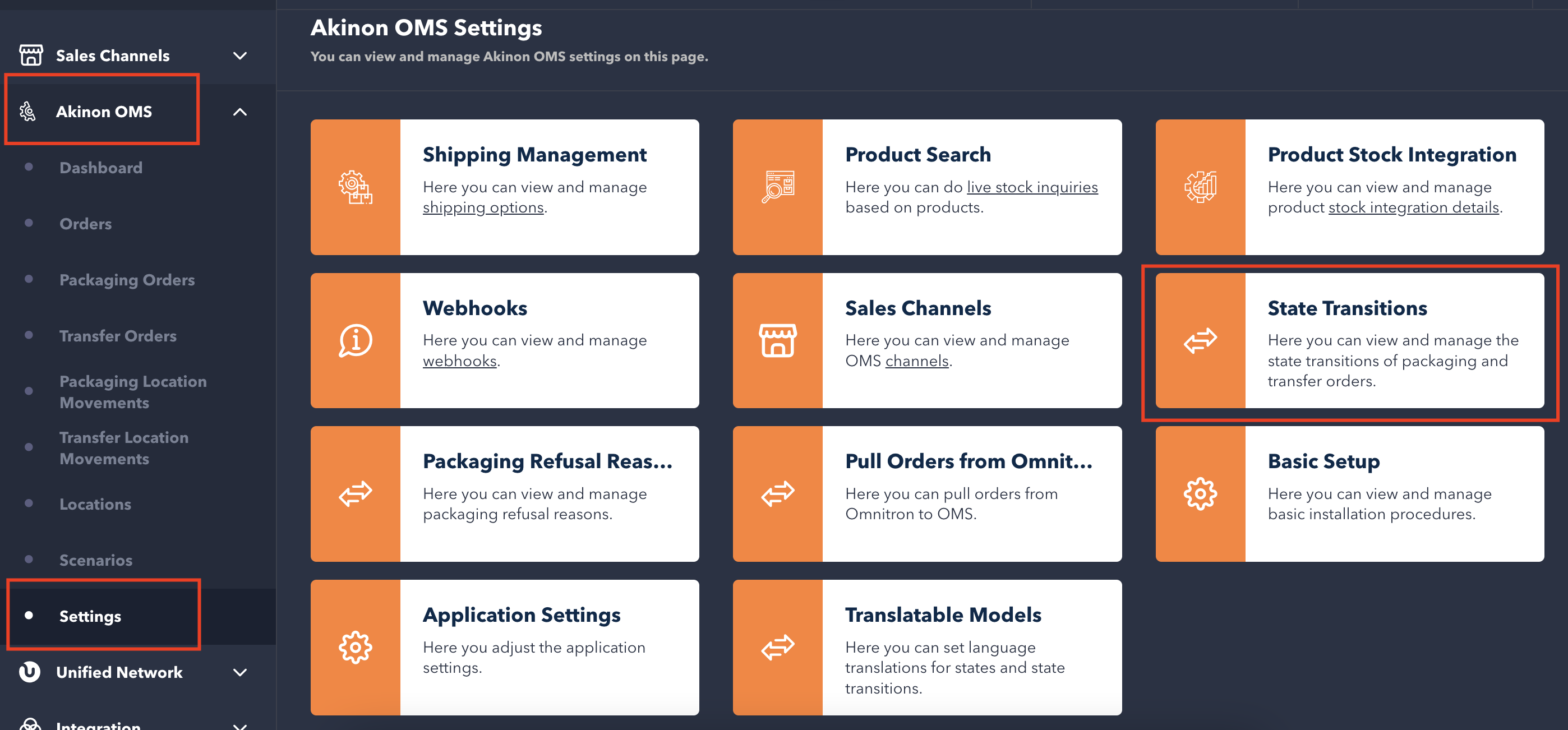 To add a new state transition, start by selecting the Settings tab under the Akinon OMS menu.