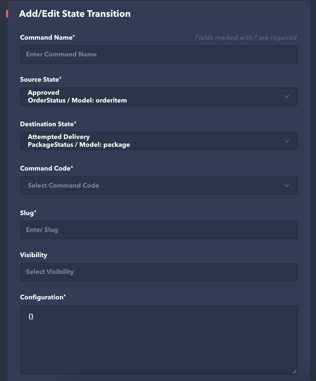 Command Name: Provide a name for the state transition. This name will be displayed on the Package/Transfer detail page.