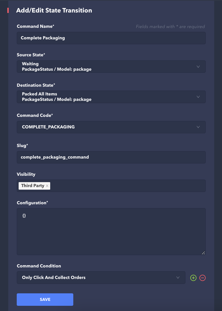 COMPLETE_PACKAGINGcommand for completing the packaging.Slug: Add a unique value to distinguish this state transition.