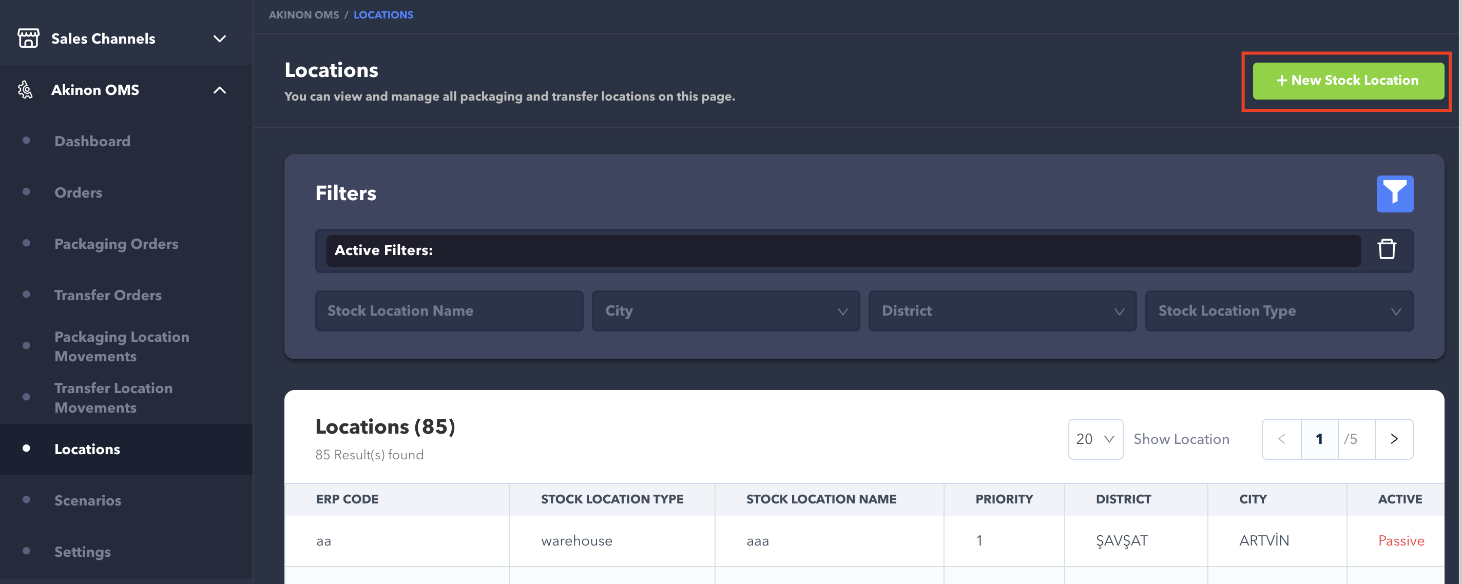 * To Access the Stock Locations page by selecting **Akinon OMS** from the menu.
