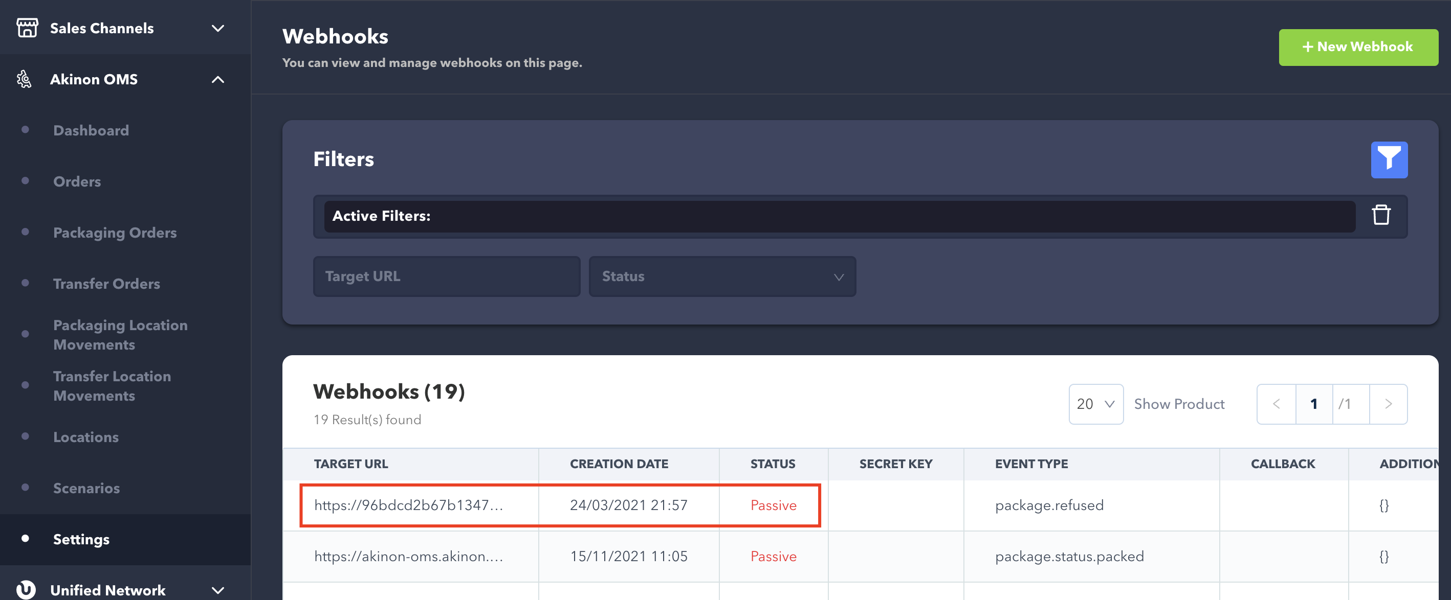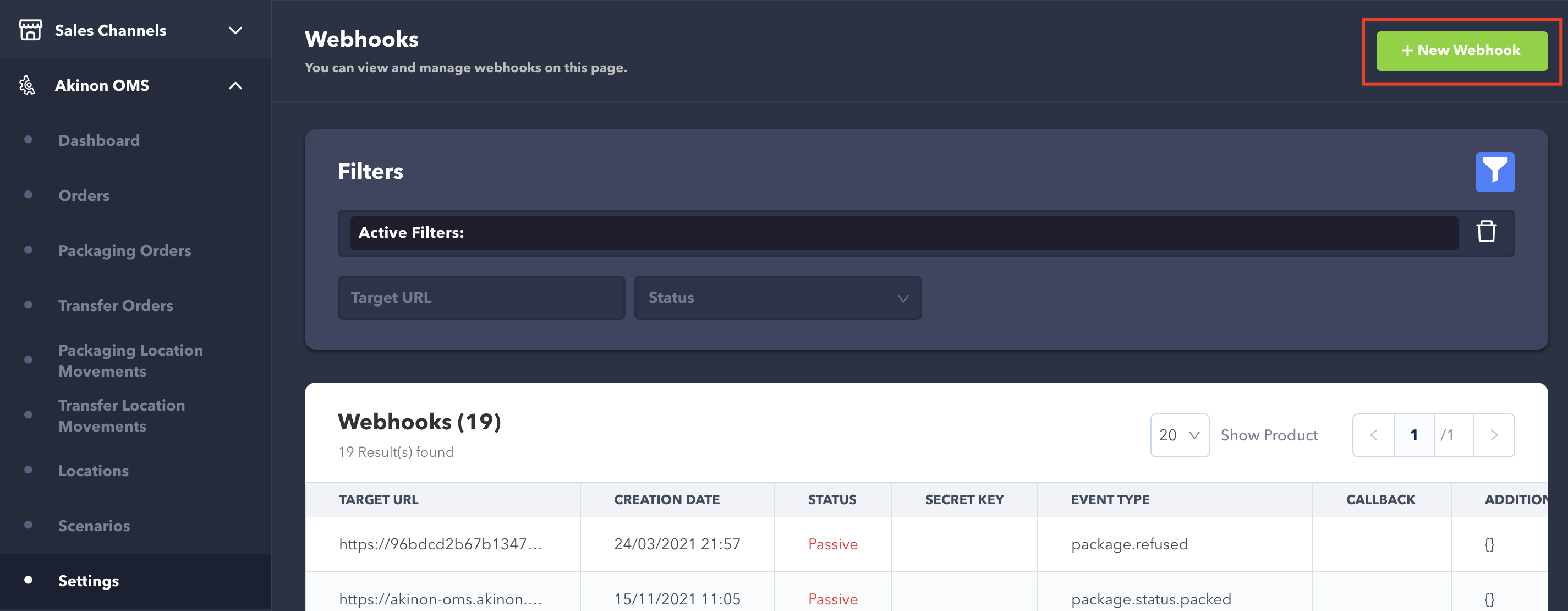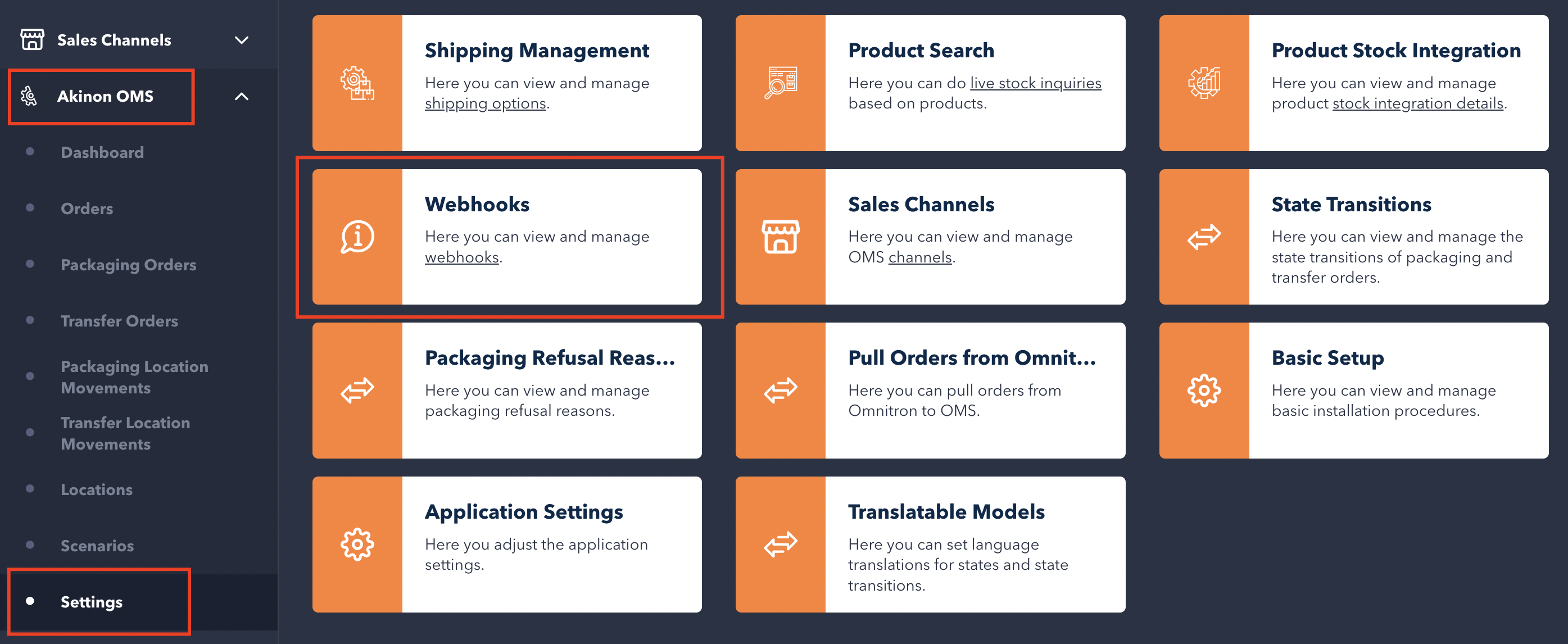* To add a new webhook, start by selecting the **Settings** tab under the Akinon OMS menu.