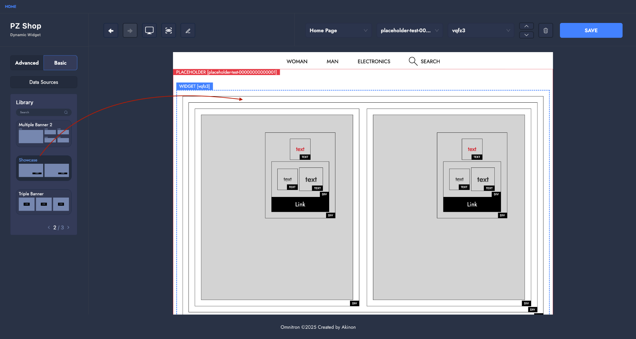 The **Showcase** template is designed to present products or featured content in a visually rich, **storefront-style layout**. It consists of **two large visual areas**, positioned side by side — one on the left and one on the right.